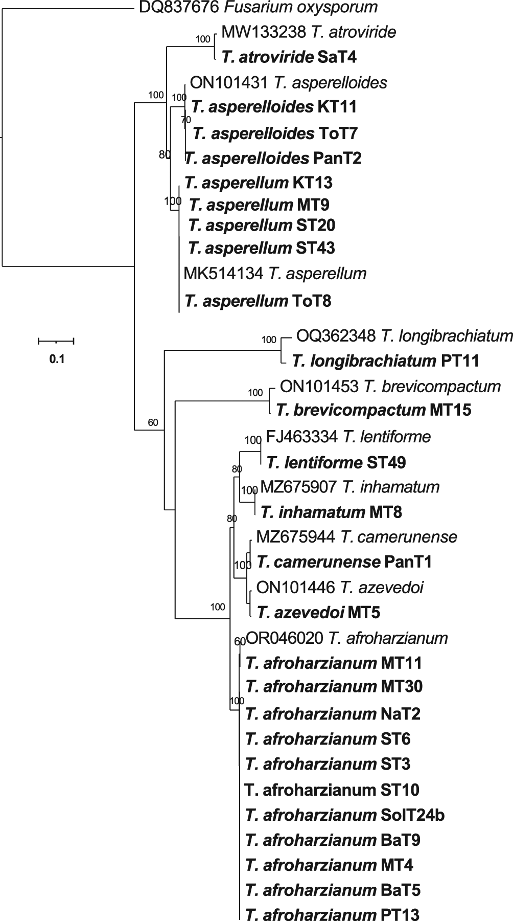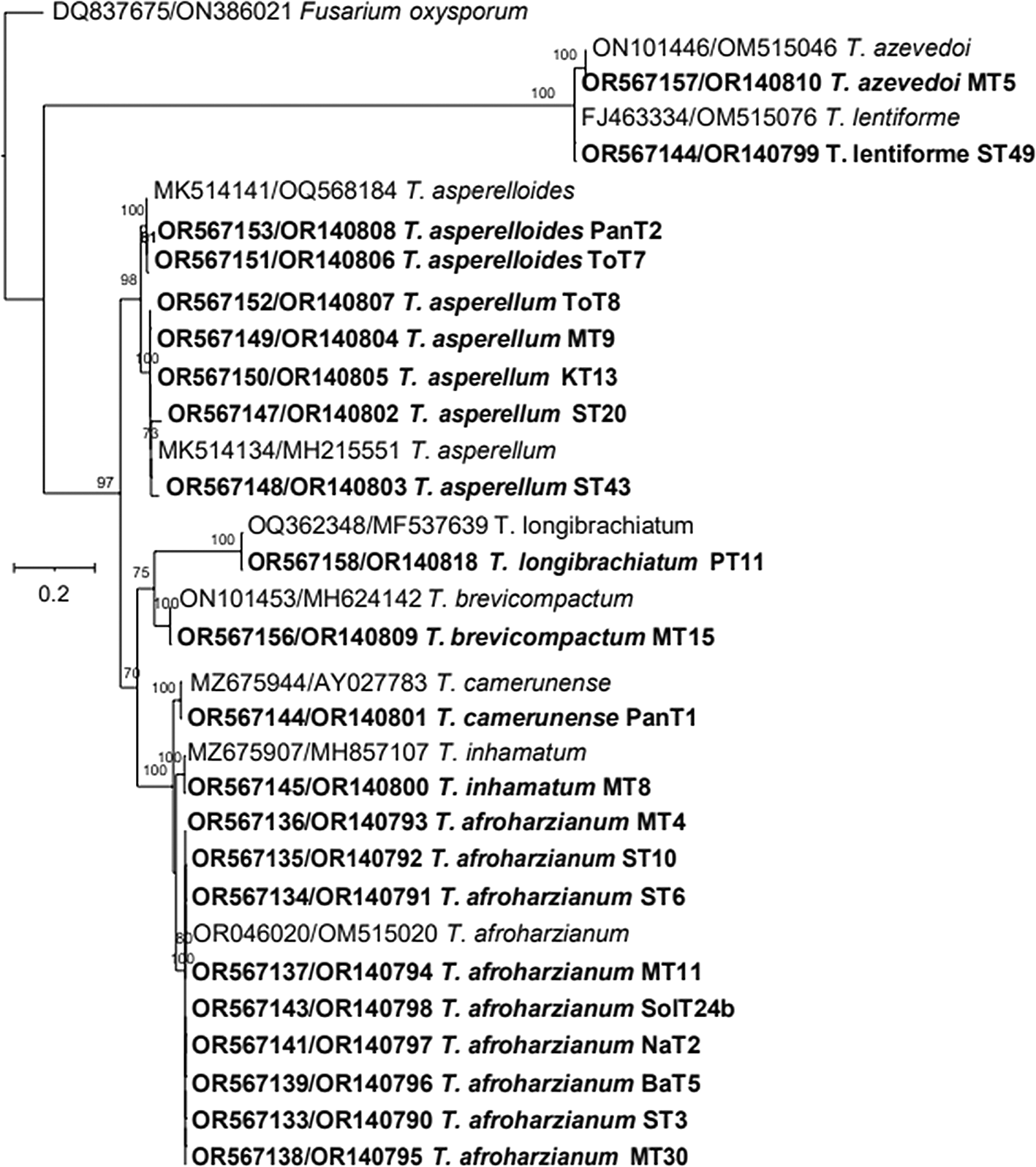 Trichoderma isolates were further identified using molecular sequencing data of ITS rRNA and tef-1α genes. Out of 33 strains, PCR and bidirectional sequencing were successfully completed for 29 presumptive isolates by ITS oligonucleotide barcode identification (OR140790-OR140818) and for only of 26 isolates using tef-1α (OR567133-OR567158). The average consensus sequence length for tef-1α was 663 bp, while for the ITS rRNA, it was 646 bp. Nucleotide BLAST analysis and pairwise alignments of the ITS rRNA and tef-1α sequences identified the Trichoderma isolates as belonging to T. harzianum, T. afroharzianum, T. lentiforme, T. inhamatum, T. camerunense, T. azevedoi, T. atroviride, T. asperellum, T. asperelloides, T. brevicompactum, T. koningii and T. longibrachiatum which shared 97-100% identity match with published sequences in the NCBI database.