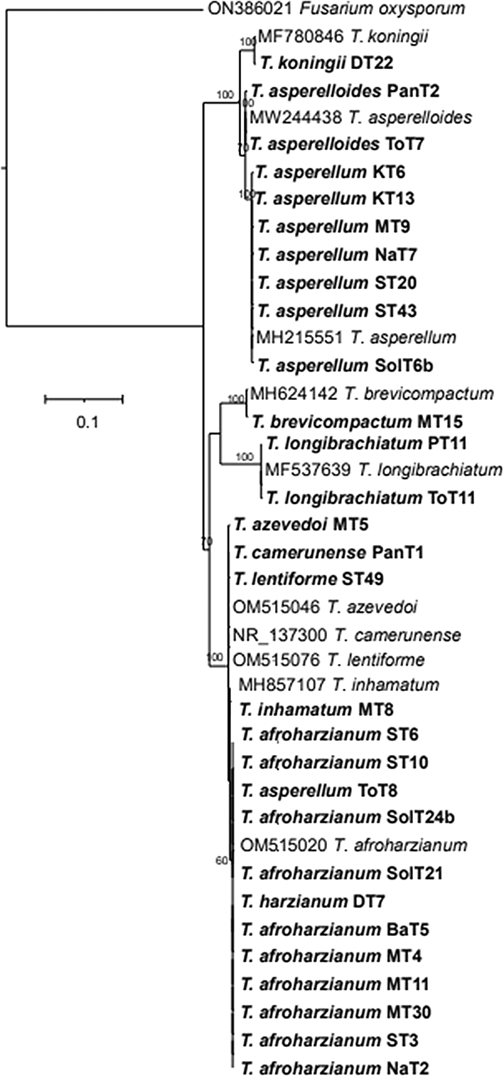 Trichoderma isolates were further identified using molecular sequencing data of ITS rRNA and tef-1α genes. Out of 33 strains, PCR and bidirectional sequencing were successfully completed for 29 presumptive isolates by ITS oligonucleotide barcode identification (OR140790-OR140818) and for only of 26 isolates using tef-1α (OR567133-OR567158). The average consensus sequence length for tef-1α was 663 bp, while for the ITS rRNA, it was 646 bp. Nucleotide BLAST analysis and pairwise alignments of the ITS rRNA and tef-1α sequences identified the Trichoderma isolates as belonging to T. harzianum, T. afroharzianum, T. lentiforme, T. inhamatum, T. camerunense, T. azevedoi, T. atroviride, T. asperellum, T. asperelloides, T. brevicompactum, T. koningii and T. longibrachiatum which shared 97-100% identity match with published sequences in the NCBI database.