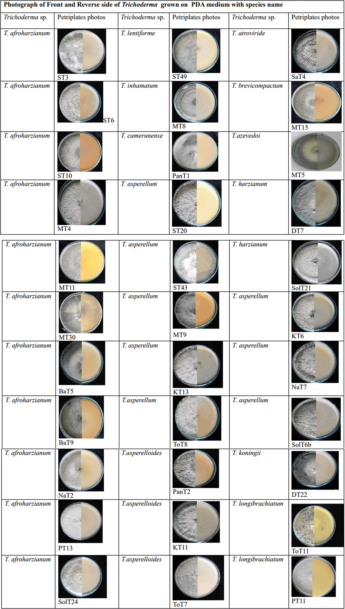 The colony characteristics of Trichoderma isolates were investigated on PDA plates that were incubated at 28°C under dark conditions. Notably, all Trichoderma isolates developed conidia within 4-5 days. Various diffusible pigments were observed, manifesting as distinct colors, which were then compared with the Audrey & Bear Color Chart (https://audreyandbear.com/products/audrey-bear-color-chart). Additionally, the presence or absence of a coconut odor was noted following 48 hours of culturing on PDA plates.41