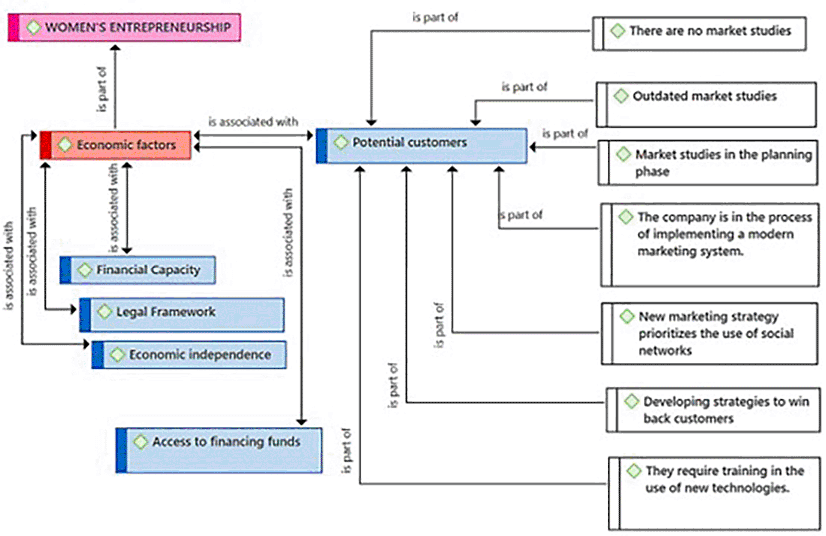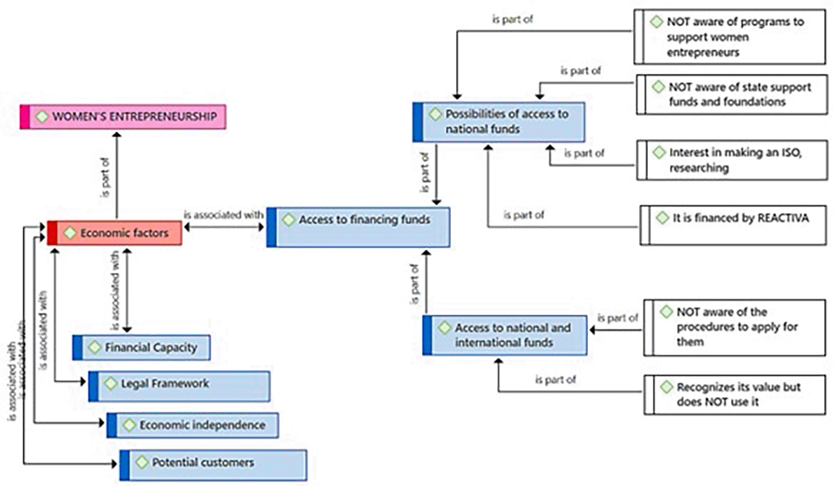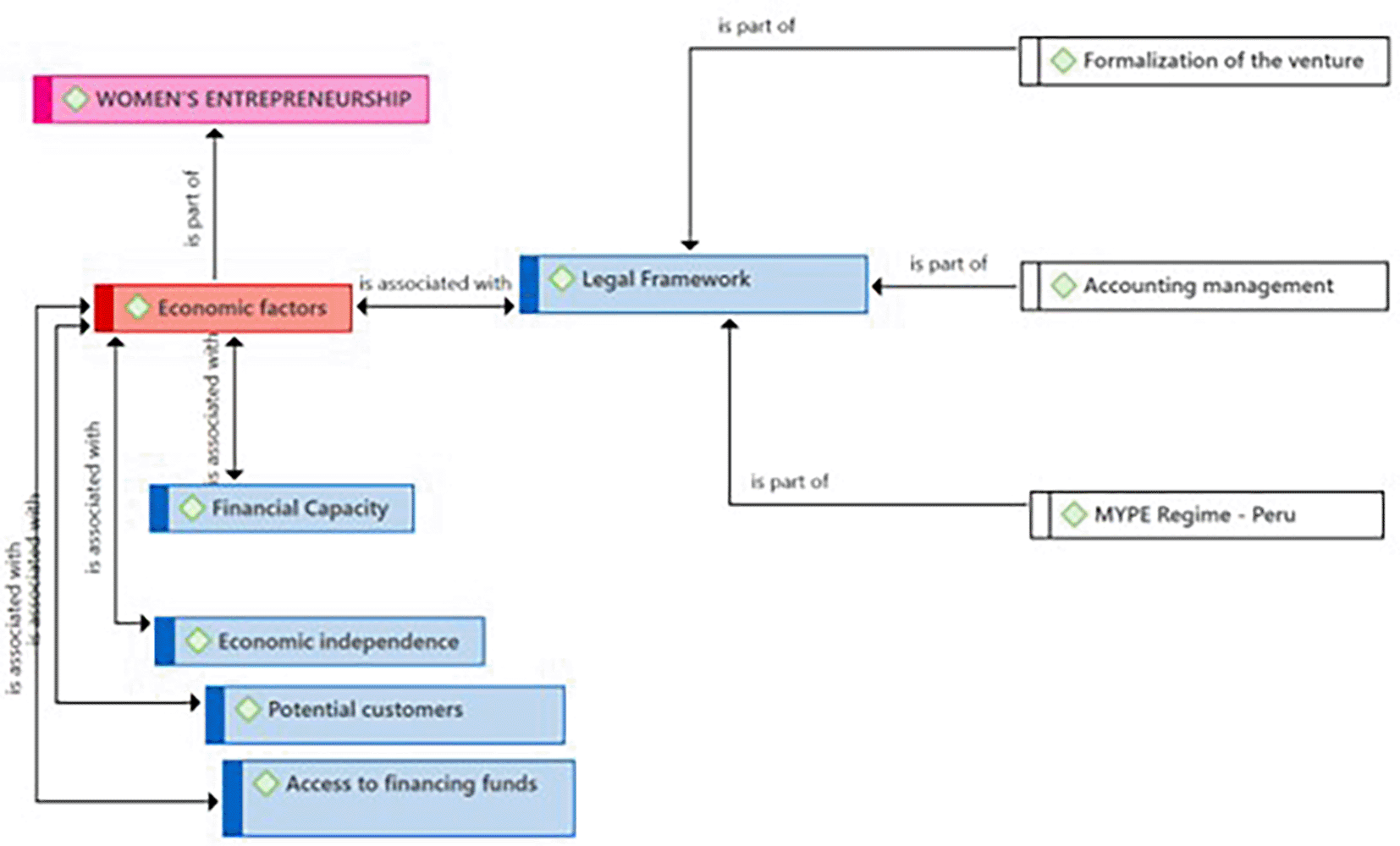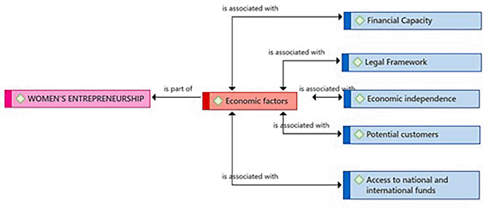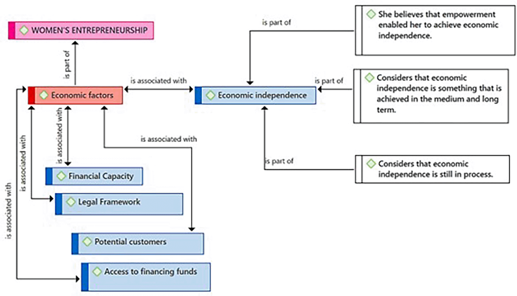 Figure 1 presents the Economic Factors category as a component resulting from the coding process of the central theme (Female Entrepreneurship). According to the entrepreneurs, these economic factors are linked to the Financial Capacity subcategory, necessary for managing those financial resources essential for the success of female entrepreneurship. The practitioners consider the existence of a Legal Framework with the security that is felt when an enterprise is not only successful but also formal. Likewise, they identified Economic Independence as another key related subcategory. Regarding the Potential Customers subcategory, they consider it also connected to Economic Factors. Finally, the entrepreneurs consider that the subcategory Access to national and international funds represents a need that goes beyond local borders for the growth and expansion of Female Entrepreneurship.