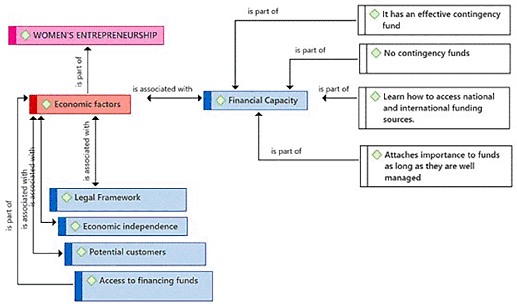 Figure 2 highlights Financial Capacity as a critical subcategory in the context of female entrepreneurship, as perceived by the participants. From their point of view, financial capacity encompasses fundamental elements such as: having an effective fund to face contingencies; the awareness and/or situation of not having funds for contingencies, highlighting a concern for vulnerability to unforeseen events; knowledge about how to access national and international financing sources; and the importance attributed to proper fund management, reflecting a focus on responsibility and efficiency in financial resource management.