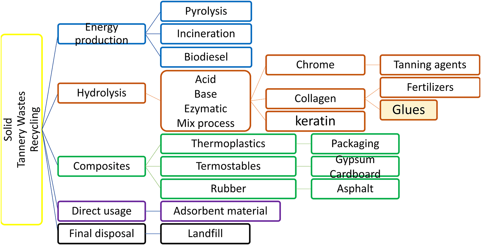 There is significant potential for innovation and improvement in collagen adhesives derived from recycled solid waste from tanneries. Exploration of collagen extraction processes, characterization, and modification is necessary to enhance its utility and sustainability. Research efforts should focus on increasing collagen’s adhesion strength, durability, and biodegradability by adding different polymers while considering its compatibility with various substrates, scalability, and commercial viability.169