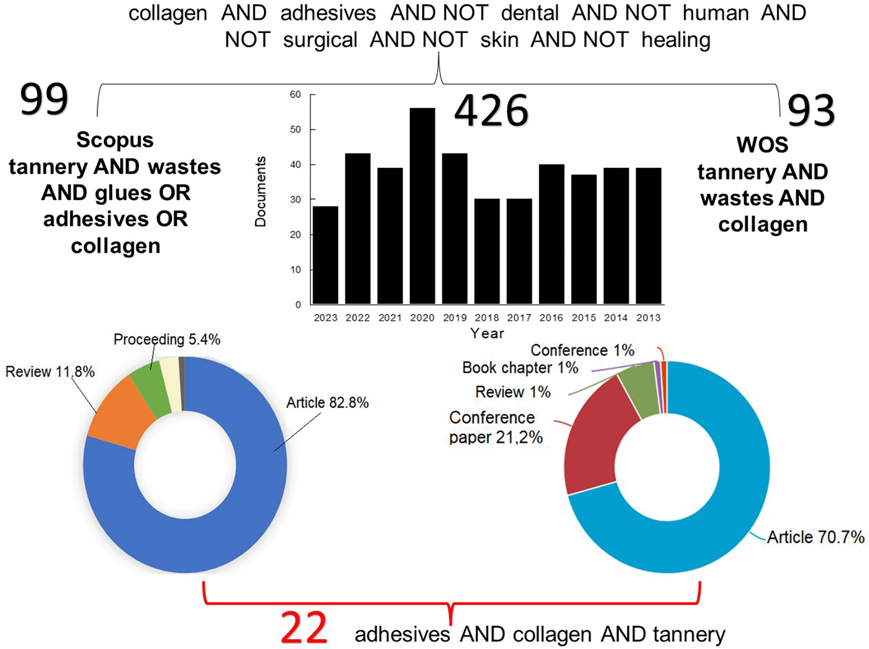 Several online databases were searched to ensure comprehensive topic coverage: PubMed/MEDLINE, MDPI, Web of Science, Scopus, and ScienceDirect. The central theme was sourcing articles discussing adhesives and glues derived from solid tannery waste, focusing on innovations that utilize recycled collagen.