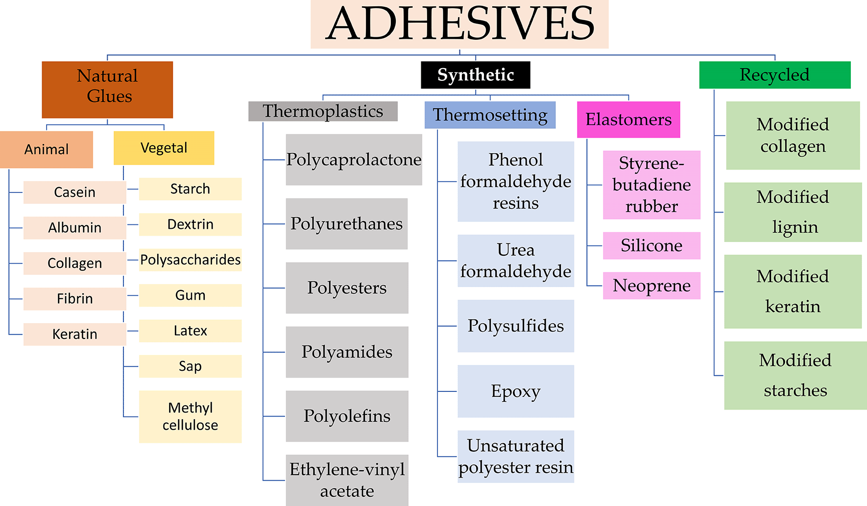 The adhesive industry has become a specialized field of science, developing numerous innovative adhesive products. To create customized formulas for specific applications, it is crucial to understand the various existing adhesive types. This differentiation forms the basis for the evolution of collagen-modified adhesives. While this review does not delve extensively into the categorization of adhesives, Figure 3 provides a concise overview of the different segments within the adhesive industry, serving as a foundational reference for understanding the different adhesive types.