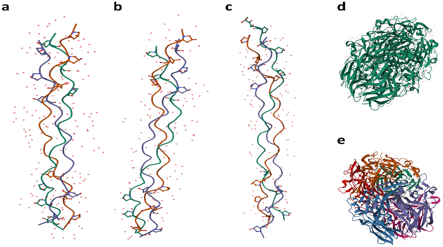 Collagen is a complex protein with approximately 28 types.84,85 This protein is characterized by a unique structure consisting of three parallel polypeptide strands with a left-handed, polyproline II-type (PPII) helical conformation that coils together to form a right-handed triple helix. This structure necessitates that every third residue be glycine, leading to a consistent XaaYaaGly sequence throughout all collagen types. Within this sequence, the amino acids at the Xaa and Yaa positions are (2S)-proline (28%) and (2S,4R)-4-hydroxyproline (38%), respectively, making ProHypGly the predominant triplet, occurring at 10.5% in collagen.86 This formation provides strength and flexibility owing to the high proline and hydroxyproline contents, which prevent the protein from assuming a globular shape. Numerous polar groups in collagen enhance the chain interactions.87,88