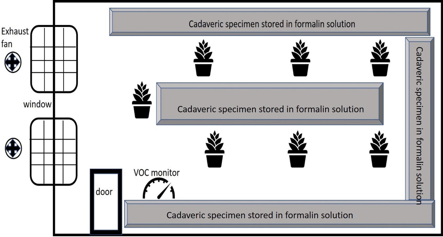 Medical students who are exposed to formaldehyde (FA) during their dissection course (Shiraishi 2006) have reported various physical symptoms, such as burning eyes, lacrimation, irritation of airways, and dermatitis. FA has attracted attention as a health hazard for students and instructors, as FA concentrations in the air of gross anatomy laboratories often exceed permissible limits. On an average, students and instructors are exposed to 5.59 ppm FA, for which the maximum permissible exposure limit, according to OSHA PEL guidelines, is 0.75 ppm—essentially more than 7 times the maximum amount—and is more than 69 times greater than the recommended levels of FA exposure in the short-term and long-term (0.08 ppm) according to the Indoor Air Quality Guidelines set by the WHO (Zuber et al. 2022; CDC n.d.; Nielsen et al. 2017). Long-term FA exposure in indoor air has been found to be carcinogenic, potentially leading to nasopharyngeal carcinoma and leukemia (Shiraishi 2006; Zuber et al. 2022; CDC n.d.; Nielsen et al. 2017). High-quality indoor air cleaners can be utilized to reduce FA levels in the air with various types of air cleaners, such as activated carbon, negative ion and photocatalytic cleaners; however, these cleaners consume vast amount of electrical power (between 39.1 W and 79.2 W), can cause secondary FA pollution, are very expensive (between $147 and $721), and are inadequate for reducing FA concentrations to meet WHO guidelines. This makes them ineffective to use in an anatomy dissection hall (Chen et al. 2007). Students and faculty utilize N95 masks as a precautionary method against the COVID-19 pandemic and wear them even in the anatomy dissection hall; however, N95 masks seem to be ineffectual at reducing FA levels to WHO standards, and hence, they fail to provide any additional benefit against the effects of FA (Chan et al. 2016). Plants affect the levels of volatile organic compounds (VOCs) in indoor environments; thus, they represent a potentially cheaper, non-electricity-consuming and greener solution for improving indoor air quality (Shaham et al. 2003). Studies of plants that reduce indoor pollution have recommended that 15 to 18 plants in 6 to 8-inch-diameter containers are required to clean the air in an average of 1,800 square foot houses. There is approximately one plant per 100 square feet of floor space (Dela Cruz et al. 2014). Studies have indicated that the average FA absorption rate of certain plants is 674 micrograms per hour for Spathiphyllum (peace lily) and 1304 micrograms per hour for Dracaena trifasciata/Sansevieria (variegated snake plant) (Wolverton and Wolverton 1993). The FA concentration in the atmosphere is affected by and directly proportional to the temperature and humidity of the air, the correlation coefficient between temperature and emission factors is greater than 0.83, and the correlation coefficient between relative humidity and emission factors is greater than 0.98 (Parthasarathy et al. 2011).