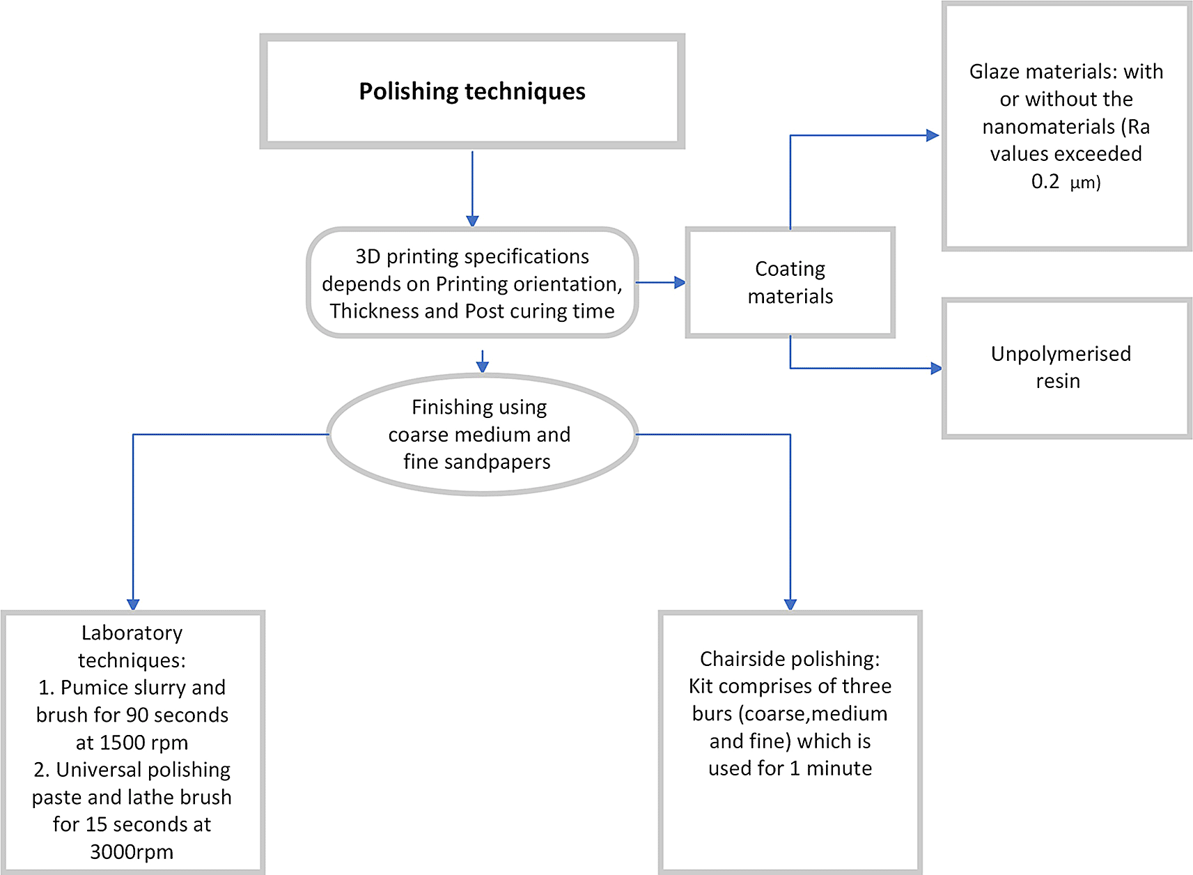 Fernandez et al., evaluated surface roughness of additively fabricated dentures coated with the same unpolymerized material.2 Coated specimens demonstrated Ra values of 0.16 μm well within the clinically relevant threshold of 0.2 μm. Although, solely coated specimens did not yield any superior outcome to solely polished specimens.2 The coated and polished specimens gave superior results.2 However, coating with unpolymerized material to 3D-printed dentures may be regarded as an alternative to conventional polishing.2 Various polishing methods have been summarised in Figure 2.