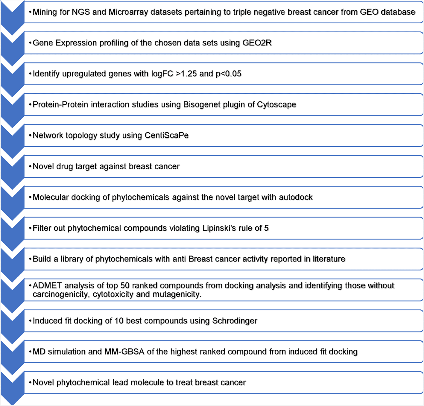 In this study, we retrieved TNBC samples from NGS and microarray datasets in the Gene Expression Omnibus database and employed a combination of differential gene expression studies, protein-protein interaction analysis, and network topology investigation to identify the target protein. Using molecular docking and molecular dynamics simulation studies, followed by Molecular Mechanics with Generalised Born Surface Area solvation, a potential lead molecule was identified.