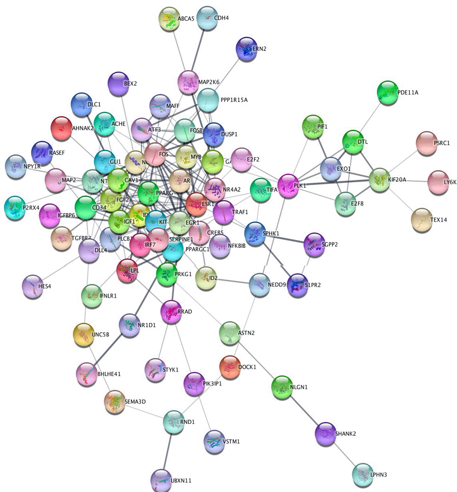 The STRING tool was used to identify potential connections between DEGs in different tissues.12 To build PPI networks, active interaction sources such as databases, co-expression, text mining, experiments, and species restricted to “Homo sapiens” were used, along with an interaction score greater than 0.4. The PPI network was displayed using Cytoscape v3.6.1 software as depicted in Figure 2.
