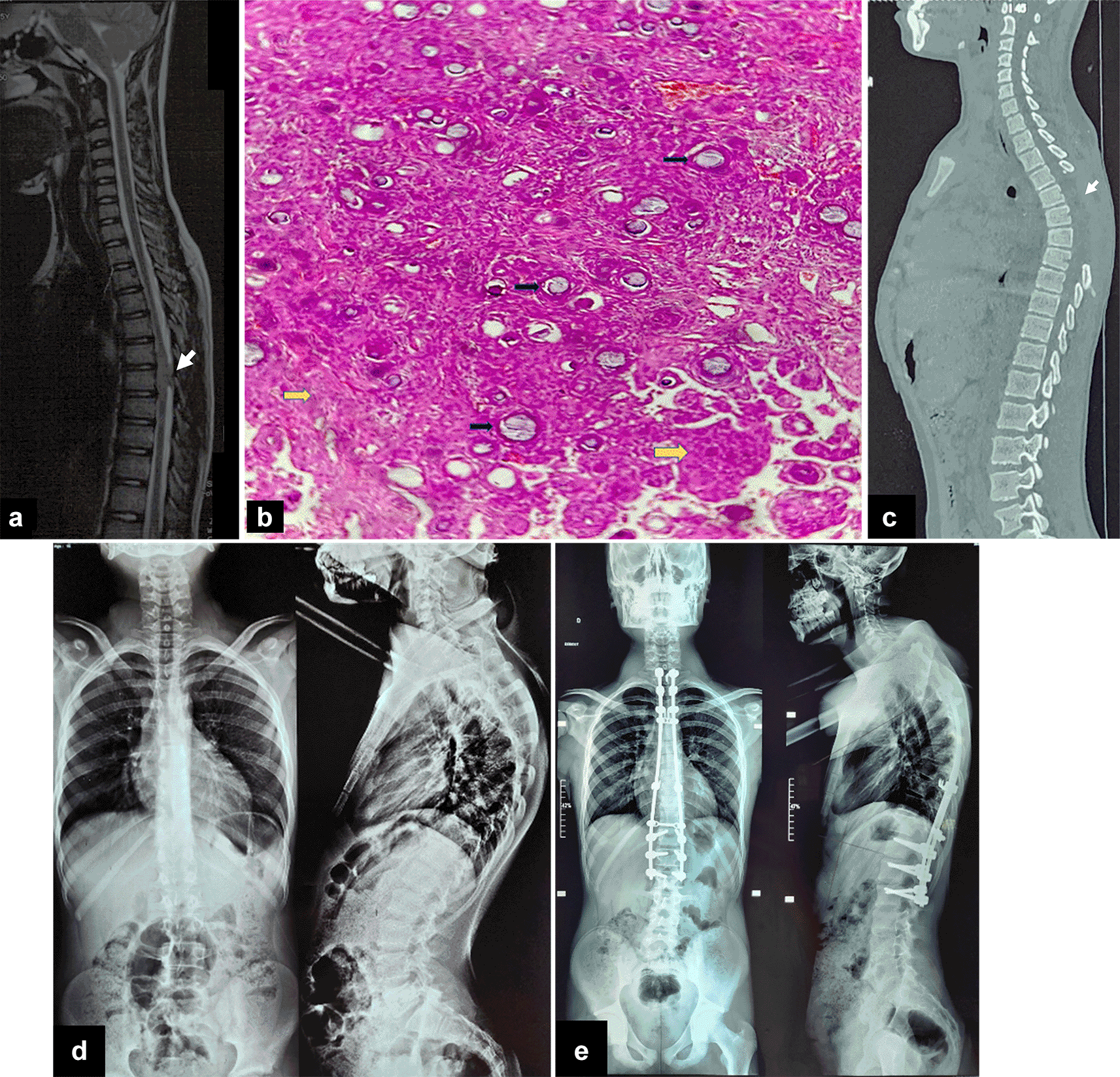 Unfortunately, the postoperative course was complicated by the onset of hyperalgesic back pain two months later, along with the development of dorsal hyperkyphosis [Figure 1d]. This complication was attributed to the extensive laminectomy. A posterior thoracic arthrodesis was performed [Figure 1e]. The patient is currently undergoing motor rehabilitation with favorable clinical progress.