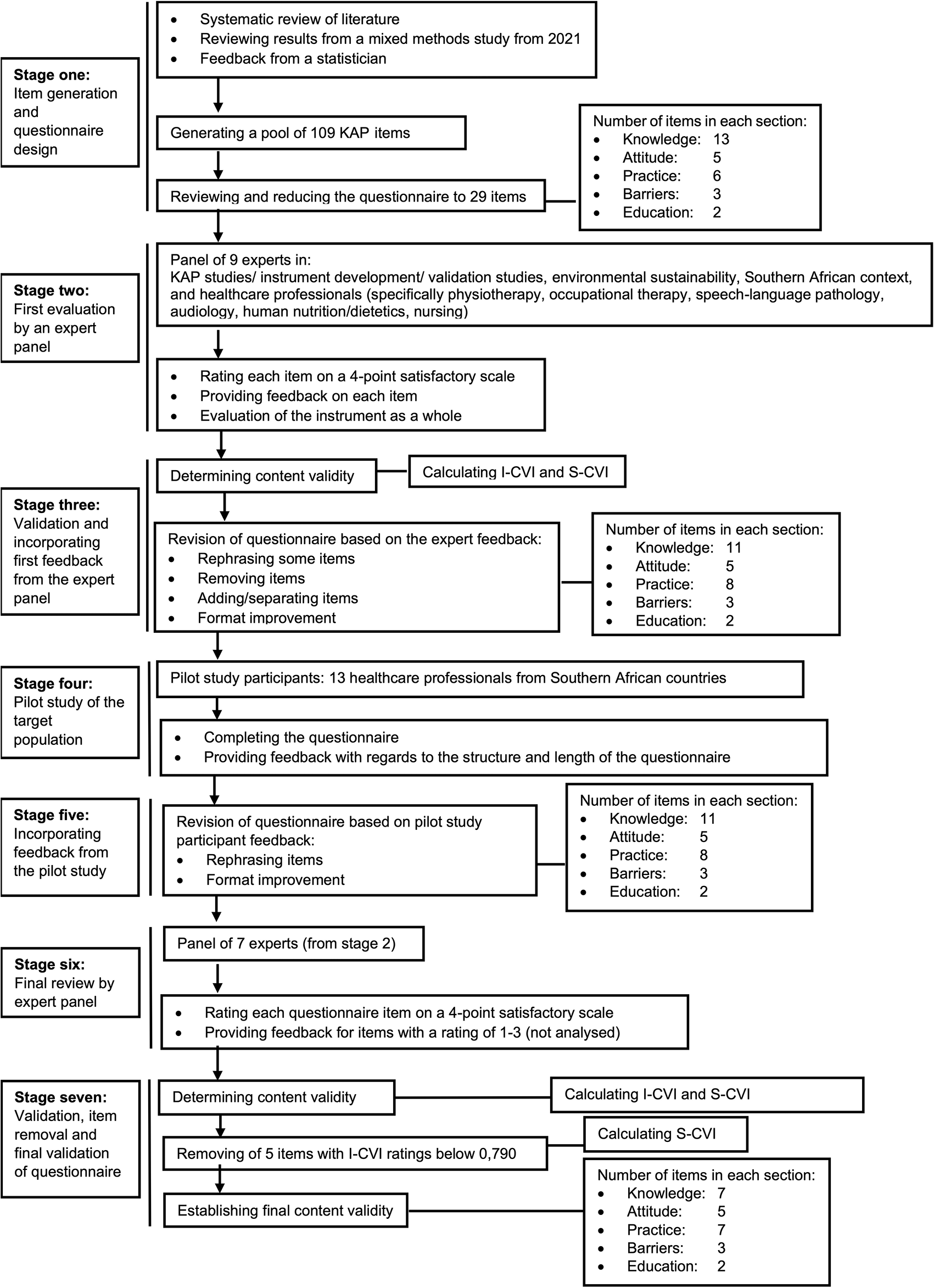 While developing and validating the instrument, the researchers recruited experts to participate in stage two (n=9) and stage six (n=7) of the study. These numbers were recommended by multiple comparable studies as a requirement for the expert panel to establish content validity.22–24 Non-probability purposive- and snowball sampling were used in the selection to identify and select experts appropriately based on the study’s inclusion criteria.25,26 The experts were recruited through social networking, using LinkedIn or ResearchGate, where both were identified as professional or academic social media platforms. To be considered as an expert, participants had to demonstrate expertise in their respective fields where sufficient expertise was defined through one or more of the following: holding academic qualifications at master, doctoral or higher level; being a researcher in a relevant subject field; having relevant publications and/or clinical experience. Here, relevant fields included: KAP studies/instrument development/validation studies, environmental sustainability, the Southern African context and healthcare from either of the following professions: physiotherapy, occupational therapy, speech-language pathology, audiology, human nutrition and dietetics, or nursing. Unlike the mixed-methods study of 2021,21 the profession of human nutrition and dietetics was included in this study as this is a prevalent profession in delivering healthcare.