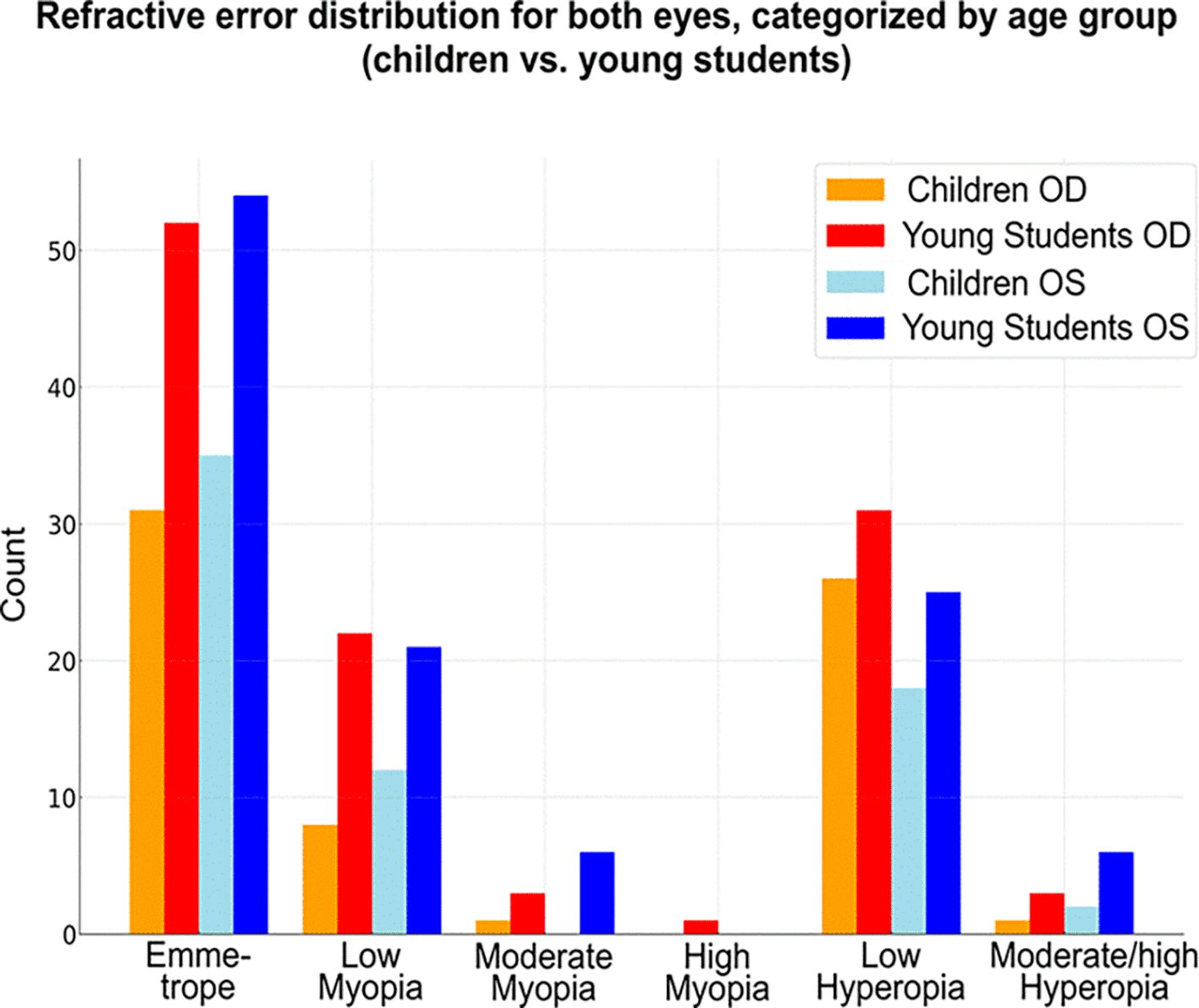 Among the 179 patients, emmetropia was the most commonly observed refractive status, present in 68 patients (38%). Low hyperopia and low myopia were also common, with 64 and 40, respectively. A limited number of patients had moderate/high myopia and moderate/high hyperopia; in detail, the prevalence was as follows: 5% of patients had moderate myopia, while 0.5% of patients suffered from high myopia; symmetrically, 5% were moderate to high hyperopia. From the data collected, a trend emerged for a low refractive error and symmetric refractive error in both eyes.