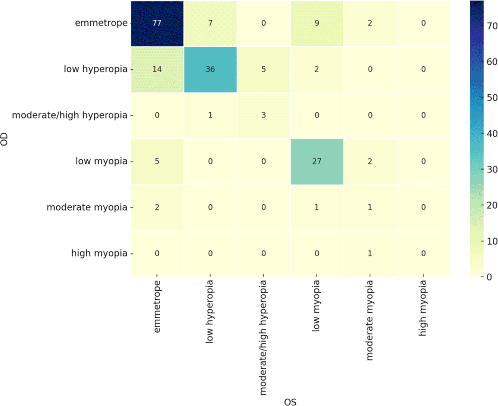 A cross-tabulation of refractive errors between the two eyes indicated a high degree of symmetry. Most patients exhibited very similar refractive classifications in both eyes, particularly those who were emmetropic or had low myopia, as illustrated in the confusion matrix ( Figure 2). This bilateral consistency suggests a strong underlying correlation in refractive status, even though no formal statistical test was performed. While some asymmetry was observed in cases with moderate to high refractive errors, these represented a small minority of the sample.was initially applied, the distribution suggests strong bilateral consistency.
