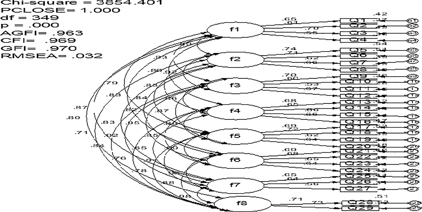 Confirmatory factor analysis (CFA) is the most suitable technique for cross validating the factor structure of a test, as per Byrne (2001). Using the AMOS version 26.0 statistical tool, a covariance matrix (Figure 1) was used to evaluate the validity of the item allocation to the eight SEEQ measures (IBM Corp, 2024a). The eight-factor structure proposed for the original scale has been confirmed by the Arabic version of SEEQ’s acceptable CFA indices (Figure 1).