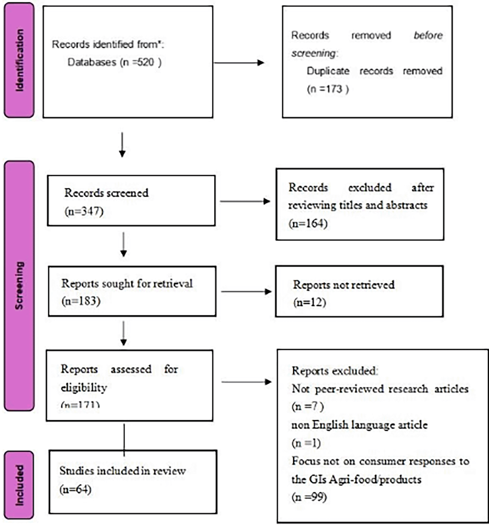 In the final eligibility assessment, the full texts of the 163 articles were evaluated against the core inclusion criteria of this review, namely that the study reported empirical consumer research and examined consumer responses to GI agri food products. Empirical consumer research was defined as studies providing original consumer level evidence, such as surveys, experiments, choice modelling, or interviews, and consumer responses included outcomes such as perceptions, preferences, willingness to pay, purchase intentions, or choice behaviour. Based on these criteria, 99 articles were excluded because they did not report consumer data or did not analyse consumer responses to GI agri food products. The final sample therefore consisted of 64 studies, labelled sequentially as ID1 to ID64 (listed in Appendix A).