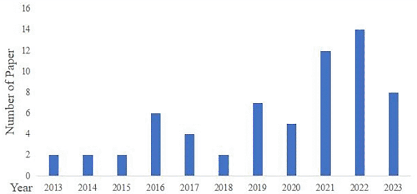 These 64 articles were published between 2013 and 2023 ( Figure 2). From 2013 to 2020, annual publication output remained relatively stable, with no more than seven papers per year. From 2021 onward, the number of publications increased markedly, reaching 14 papers in 2022. This pattern suggests growing scholarly attention to consumer related research on GI agri food products in recent years.