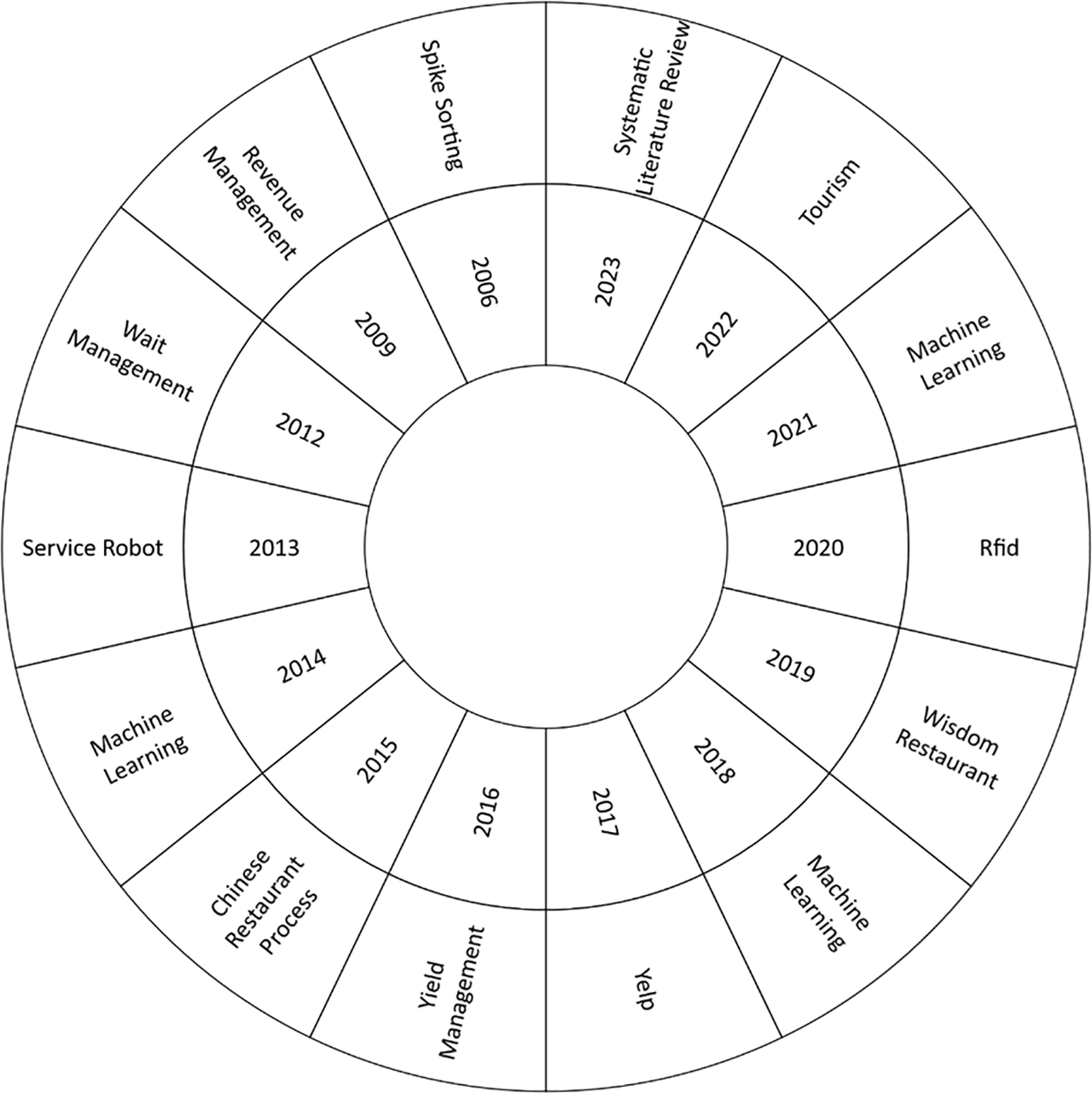 The current study, as shown in Figure 6, focused on the most used keyword in each research year to perform a comprehensive analysis of the thematic evolution in the Smart Restaurant literature between 2006 and 2023. As a starting point, it should be noted that 2006 is notable for the emergence of ideas such as “spike sorting”. Emerging topics such as “Radio-Frequency Identification” (RFID)”, “Machine Learning”, “Tourism”, and “Systematic Literature Review” become more prevalent over the years, reflecting changing research dynamics and areas of interest. This thematic analysis provides valuable information on the current developments and trends in the field.