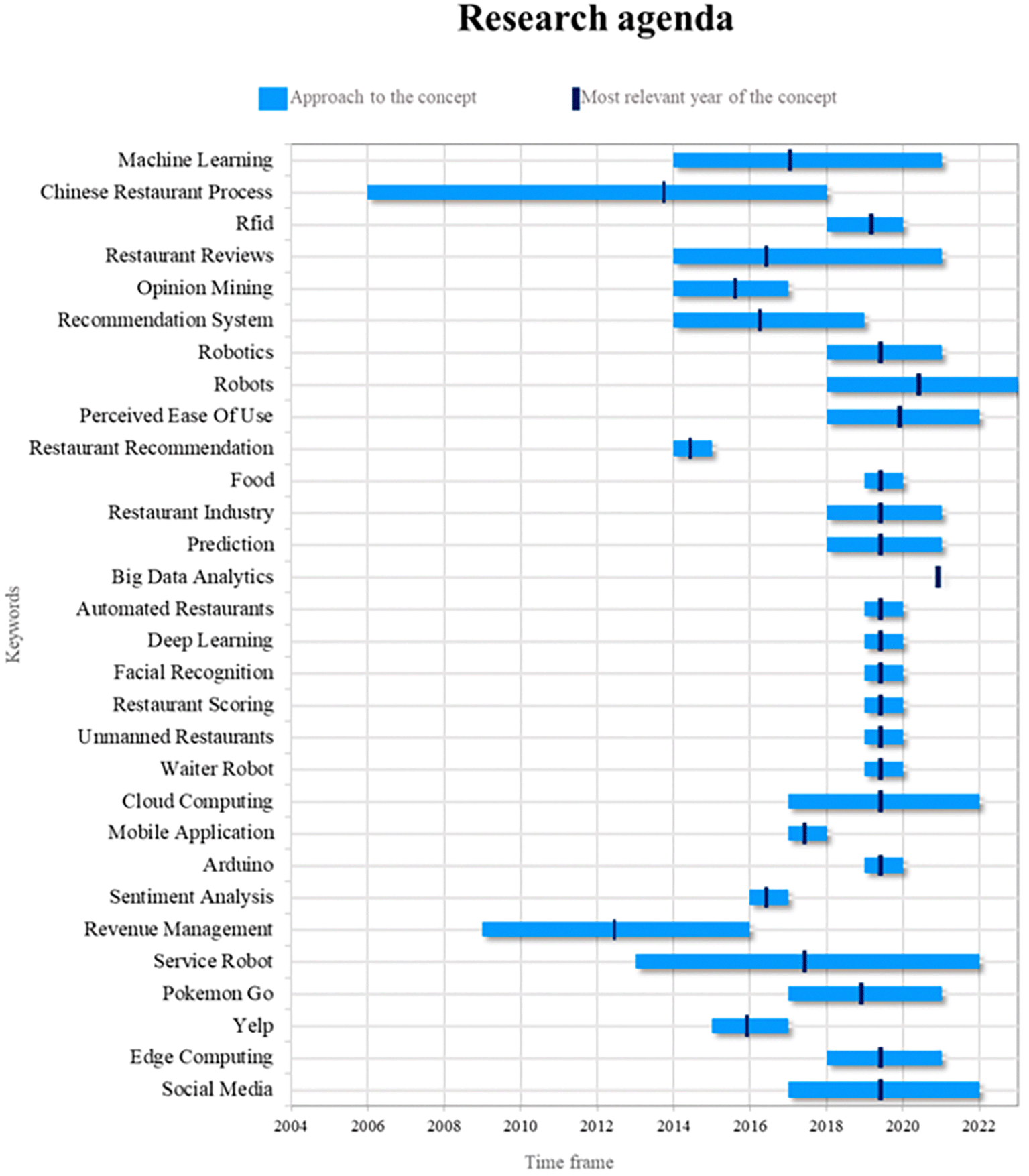 However, as smart restaurant research has advanced, CRP may be becoming less relevant in this specific context. This decline may be indicative of shifting research trends and a shift in focus towards more pertinent concepts within the smart restaurant industry, such as RFID and machine learning. This suggests that smart restaurant researchers are exploring new directions and adapting their approaches to meet technological and industrial needs.