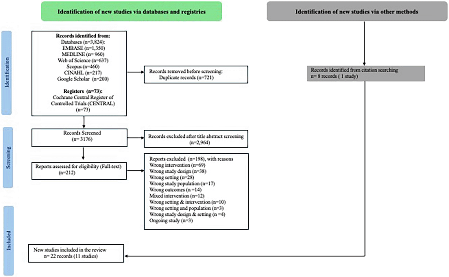 A total of 3824 records were imported into Covidence software (https://www.covidence.org/) for screening, sourced from various databases: Embase (1350), CINAHL (217), Web of Science (637), Scopus (460), Medline (960), and Google Scholar (200). After removing 721 duplicates, 3103 records underwent screening based on their titles and abstracts using Covidence software. We could not export records from Cochrane (CENTRAL) to Covidence. Hence those records (73) were screened separately on Excel. We assessed 212 full texts for eligibility. We could retrieve 14 records (10 studies) on Covidence. In addition, 8 records (1 study) were found through backward and forward citation searches. Altogether we have included 11 studies for data extraction ( Figure 1). We did not find any studies that focussed on incentive-based behaviour change intervention conducted in LMICs during the antenatal care period among pregnant women for e.g. incentive-based smoking/tobacco cessation interventions, incentivised nutrition-focussed interventions for appropriate dietary behaviour during pregnancy, etc.