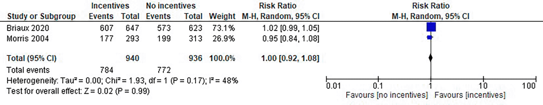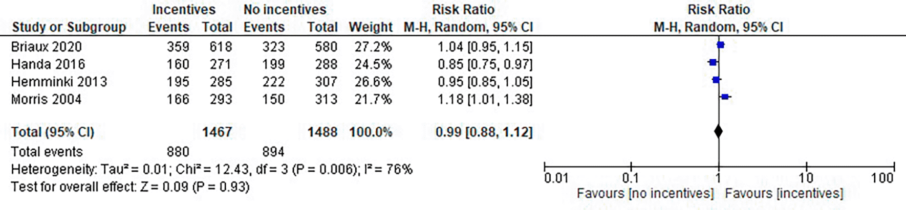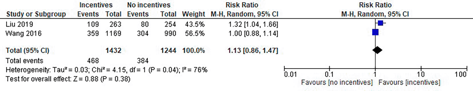 Overall, these studies exhibited various concerns regarding risk of bias. Incentives differed, including vouchers, cash transfers, and mama kits, which may limit their generalizability across different communities in LMICs. Additionally, the insufficient data prevented us from conducting a subgroup analysis based on incentive types. The meta-analysis included fewer than ten studies, so we did not perform a funnel plot. There is a potential for publication bias, especially since we did not search trial registries in LMIC regions.