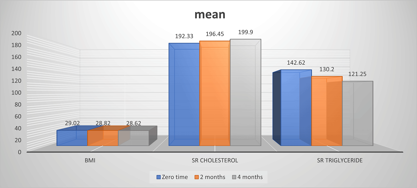According to the study’s findings, there is no a statistically significant correlation between the mean BMI and serum cholesterol after two months (p=0.114,0.227 respectively), However, the results, as indicated in Table 4, reveal a statistically significant difference among mean of S. triglycerides after 2 months (p=0.001).