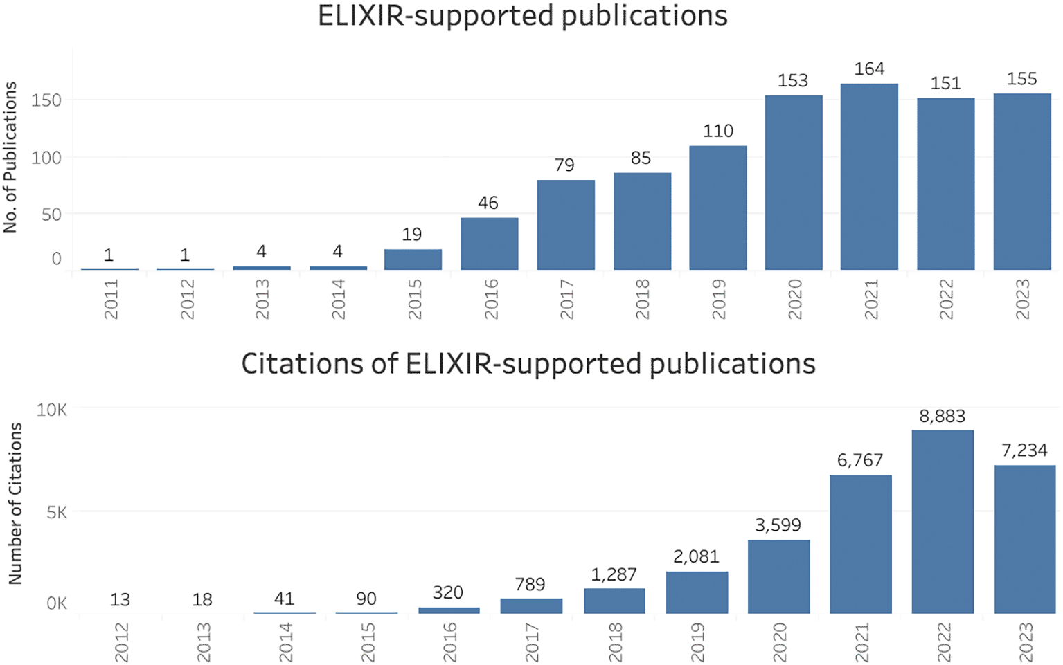 Around 700 bioinformaticians and related professionals across Europe form the developers and operators of the ELIXIR infrastructure and resources, and are typically working part-time on ELIXIR matters, often alongside more conventional research activities. These professionals usually have research profiles and, through their daily work on ELIXIR matters, actively contribute to the generation and dissemination of new technical and scientific knowledge linked to the development and operation of the ELIXIR infrastructure and its resources. These efforts are enabled (in part or fully) by a range of funding sources, such as ELIXIR’s internally-funded projects (also referred to as ‘Commissioned Services’), national-level financing, and grant funding from the European Union and other international funders awarded in the name of ELIXIR. In line with the Open Science principles, this new knowledge is shared openly via ELIXIR-supported research publications (peer-reviewed, preprints), which collectively represent an additional source of performance metrics of ELIXIR’s scientific legacy as a research infrastructure.