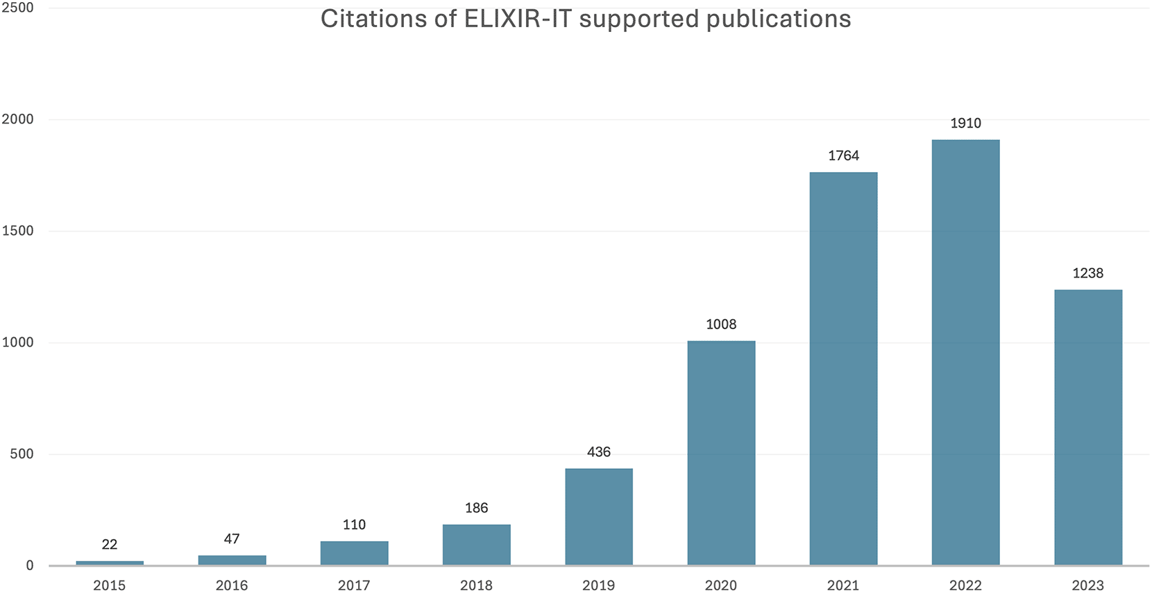 Similar to ELIXIR, ELIXIR Italy has used the curated inventories of publications and their citations for a range of internal and external monitoring activities, as required by various stakeholders, for example periodic Node reviews and presentations for ELIXIR’s Board of funders, Scientific Advisory Board and Industry Advisory Committee. The information has also been used to report to ELIXIR Italy’s own Scientific Advisory Board, as well as for the Node’s general assembly and monthly newsletters. Finally, the information has been used to report to ELIXIR’s Italy’s main funder, the Italian Ministry for Universities and Research (MUR)), notably as part of evaluation processes and of national-level grant funding for research infrastructures.
