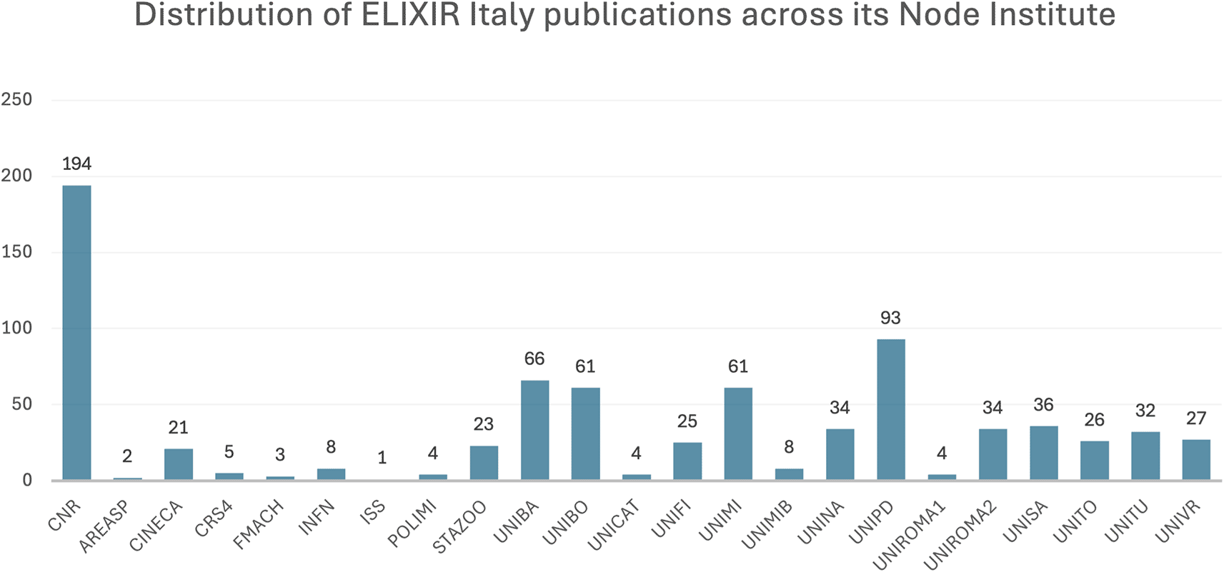 Curation in the context of the case study was a very similar process to that described above but carried out by ELIXIR Italy staff with knowledge of the Node’s activities. Author affiliations were additionally scrutinised and encoded to obtain a more granular view of dissemination efforts and scientific impact at the level of the Node’s institutes (30 in total at the time of writing). Sources of false positives were like that described above, e.g. project names such as “ORCHESTRA” (understood as the word “orchestra” or other projects called as such). As above, a balance was struck between accuracy and curation capacity by excluding problematic search terms (those returning high levels of false positives).