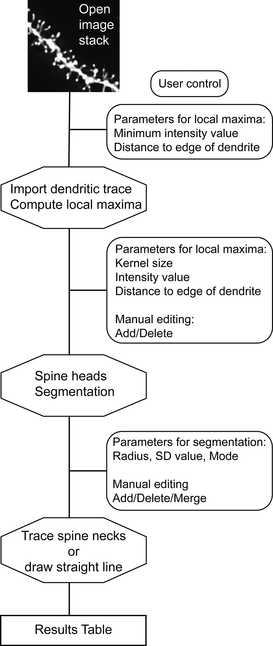 After an image stack is opened in FIJI/ImageJ and the plugin launched, the user is invited to set parameters for local maxima detection. The plugin imports the dendrite model encoded in a.swc file and compute the local maxima. The user can modify the parameters and manually edit each local maximum. Spine head segmentation is performed by the plugin, and the results can be updated by modifying segmentation parameters as well as manually editing each spine head. The spine necks are then traced, but for images in which the necks are not labeled, the plugin can draw straight lines. A result table is given, including spine head volumes, spine neck length, among other measurements.