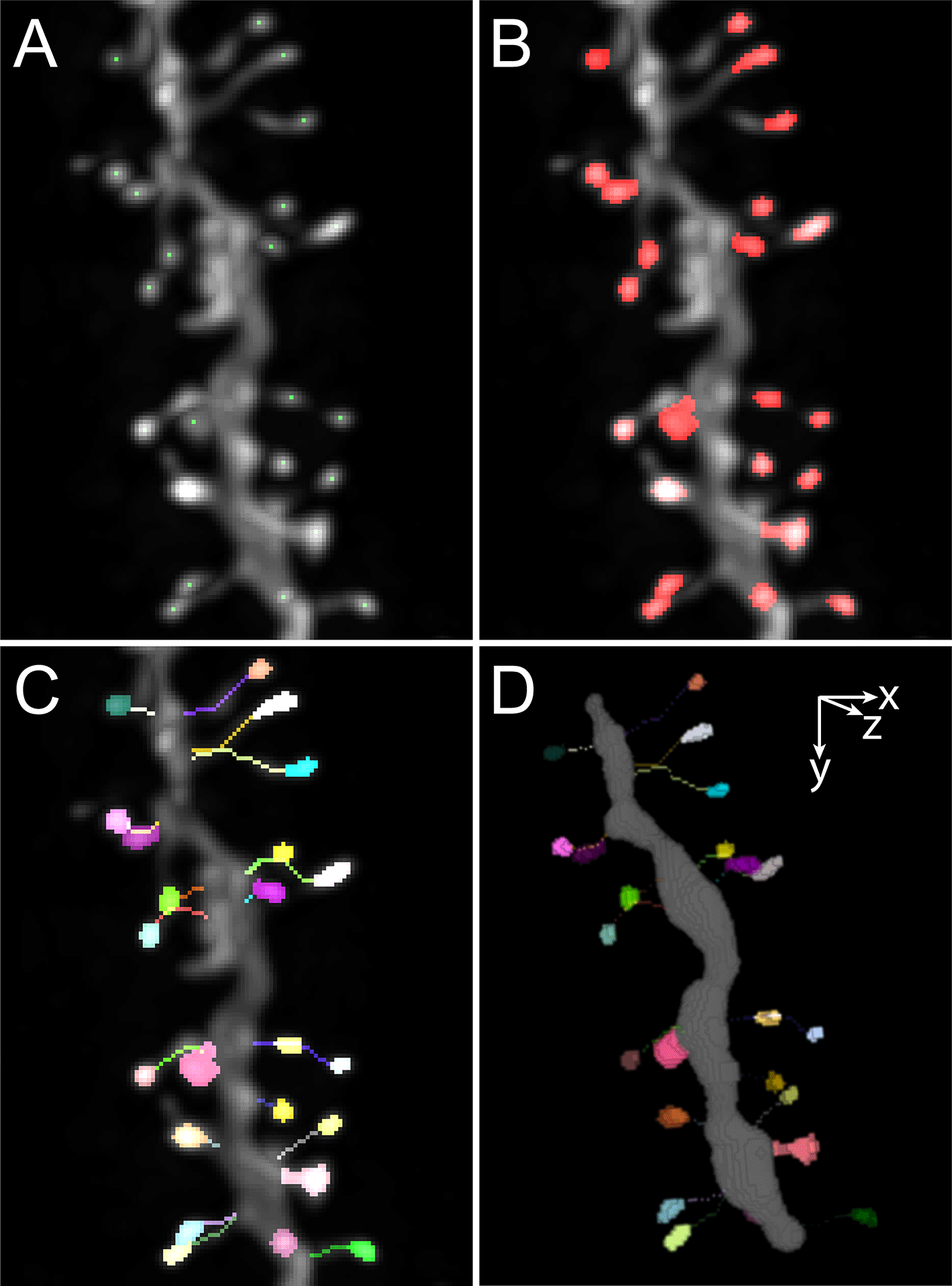 A. Maximum intensity projection showing the detected local maxima. B. Maximum intensity projection showing the segmented spine heads. C. Maximum intensity projection showing traced necks and spine heads. D. 3D volume rendering of the dendrite encoded in swc file, segmented spine heads and traced necks.