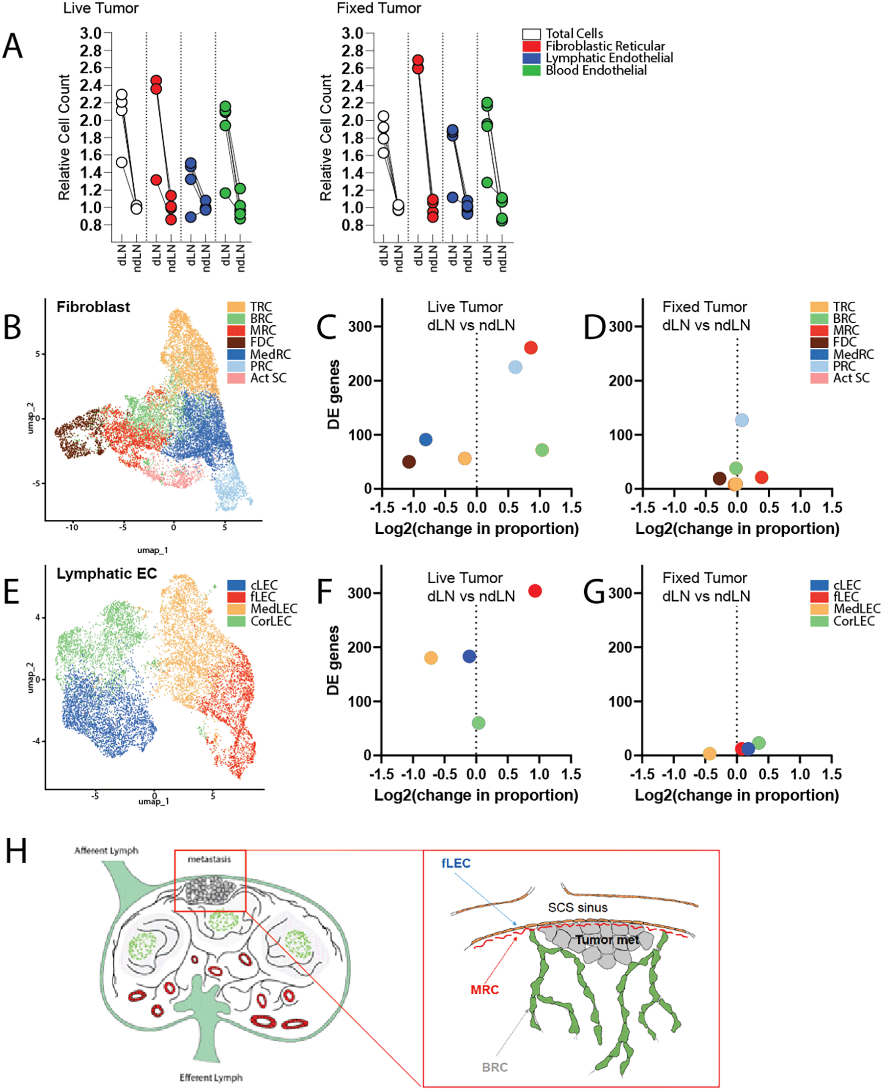 Tumor draining and contralateral non-draining inguinal lymph nodes were excised and enzymatically digested for analysis. A) Quantification of cell numbers assessed by flow cytometry (n=5 mice per condition). Data are presented as cell counts relative to the average of corresponding non-draining LN. Cell populations were identified by the following markers: Fibroblastic Reticular cells (CD45-CD31-PDPN+), Lymphatic Endothelial cells (CD45-, CD31+, PDPN+), and Blood Endothelial cells (CD45-, CD31+, PDPN-). B) UMAP visualization of total lymph node fibroblasts, colored by cluster identify. C, D) Quantification of the change in population proportion (amongst fibroblast subsets), along with total number of differentially expressed genes. C. dLN vs ndLN of mice growing live tumors. D. dLN vs ndLN of mice receiving fixed tumor cells. E) UMAP visualization of total lymph node lymphatic endothelial cells, colored by cluster identity. F, G) Quantification of the change in population proportion (amongst endothelial subsets), along with total number of differentially expressed genes. F. dLN vs ndLN of mice growing live tumors. G. dLN vs ndLN of mice receiving fixed tumor cells. H) Schematic representation of lymph node architecture and anticipated location of metastases engraftment. Inset depicts a micrometastasis surrounded by the following stromal subsets of interest: fLECs, MRCs, and BRCs.