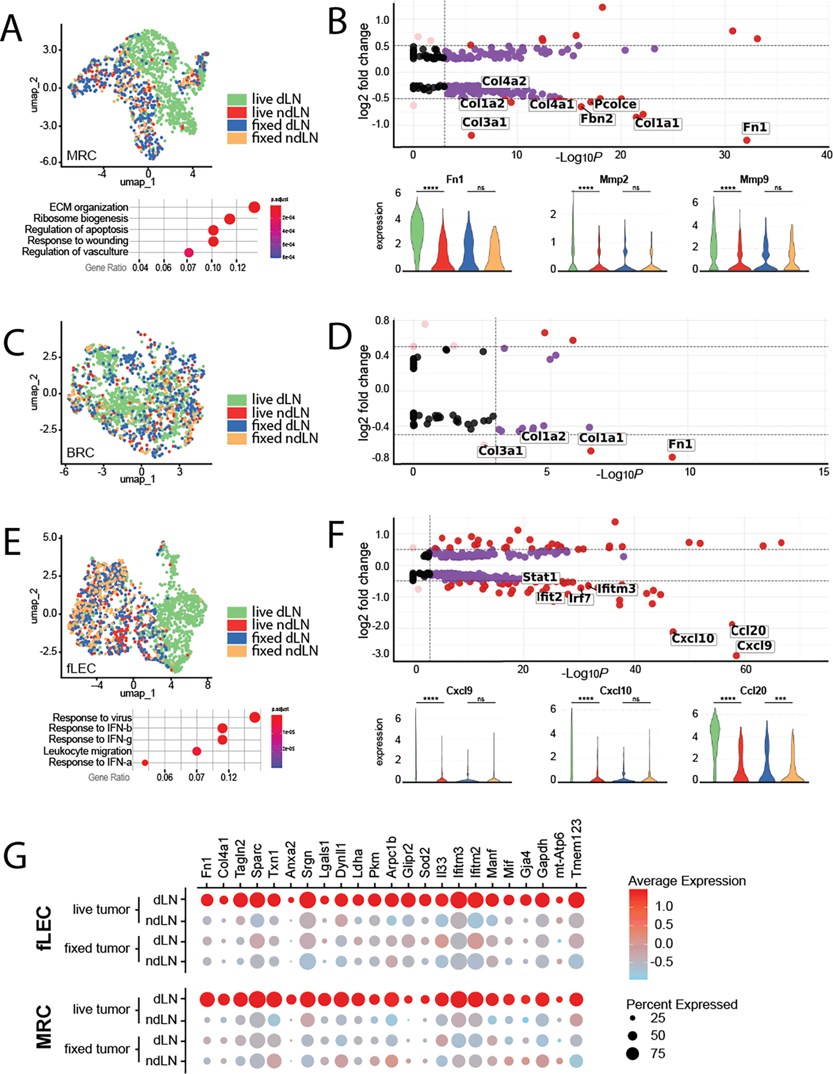 A) (top) UMAP visualization of MRCs, colored by treatment condition. (bottom) Pathways significantly enriched in MRCs of live-tumor-draining LNs relative to non-draining LNs. B) (top) Volcano plots of differentially expressed genes between MRCs of draining vs non-draining LNs. Select genes of interest are highlighted. (bottom) Violin plots of select genes differentially expressed in MRCs of the live-tumor draining LN. Expression is shown across all four experimental conditions; live draining, live non-draining, fixed draining, and fixed non-draining. C) UMAP visualization of BRCs, colored by treatment condition. D) Volcano plots of differentially expressed genes between BRCs of draining vs non-draining LNs. Select genes of interest are highlighted. E) (top) UMAP visualization of fLECs, colored by treatment condition. (bottom) Pathways significantly enriched in fLECs of live-tumor-draining LNs relative to non-draining LNs. F) (top) Volcano plots of differentially expressed genes between fLECs of draining vs non-draining LNs. Select genes of interest are highlighted. (bottom) Violin plots of select genes differentially expressed in fLECs of the live-tumor draining LN. Expression is shown across all four experimental conditions; live draining, live non-draining, fixed draining, and fixed non-draining. B, D, F) The cutoffs for highlighted genes include a log2 fold change of 0.5 or above (horizontal dashed lines) and adjusted p-value above 0.001 (indicated by the vertical dashed lines). Negative log2 fold change values indicate genes that are more highly expressed in draining lymph nodes (dLNs) relative to non-draining lymph nodes (ndLNs). G) Dotplot displaying expression of transcripts upregulated across both MRCs and fLECs in the live tdLN. The size of the dot represents percentage of cells expressing transcript, while the color indicates average level of expression within the population.