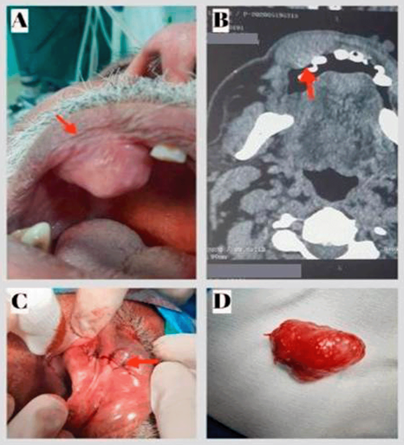Magnetic resonance imaging (MRI) revealed an ovoid well-circumscribed encapsulated mass measuring 3.7 cm in size, within the midline of the soft palate to its right para-median side. The lesion extended backward to the oropharynx and forward in the left tonsillar pillar (Figure 2B).