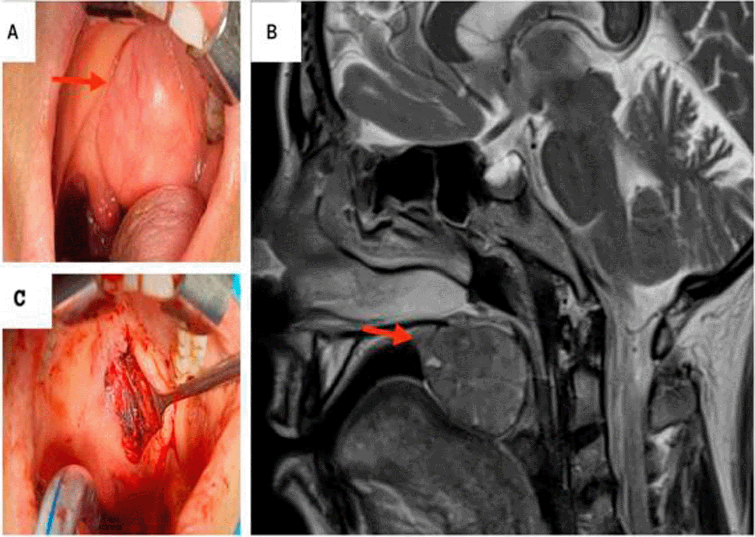 A: Preoperative view: Exposure of the mass in the palate. B: T2-weighted MRI showing a hyposignal ovoid well-defined mass within the right soft palate. C: Peroperative images: the defect post excision of the mass.