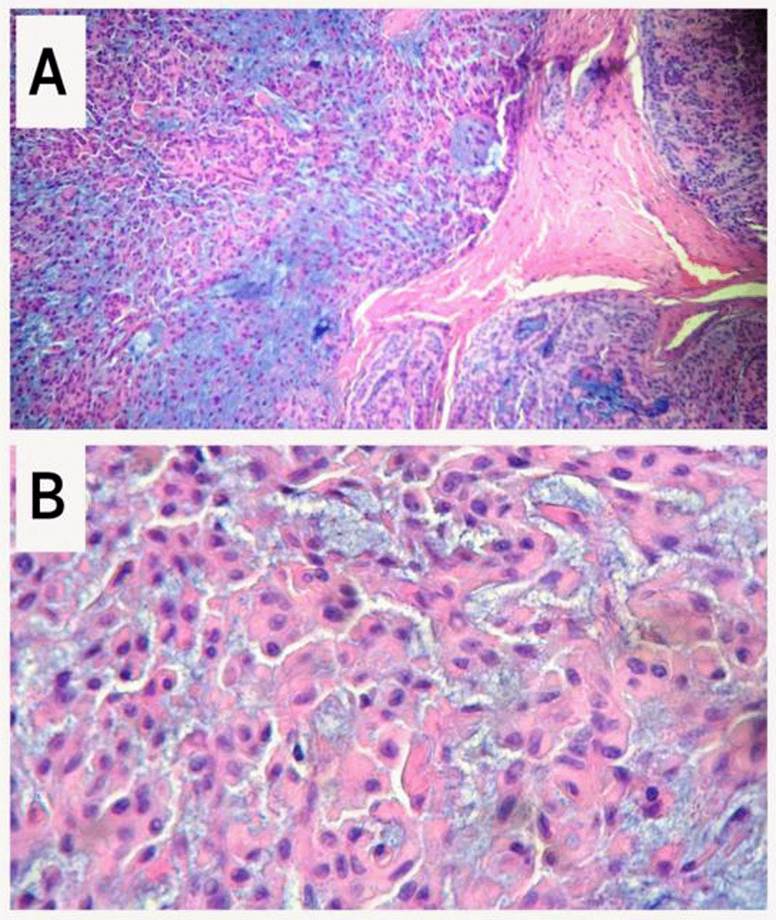 A: The tumor consists of three components: epithelial cells (right), myoepithelial cells (left), and myxochondroid tissue stroma (hematoxylin-eosin, 100×). B: Myoepithelial cells with epithelioid and plasmacytoid appearance (hematoxylin-eosin, 400×).