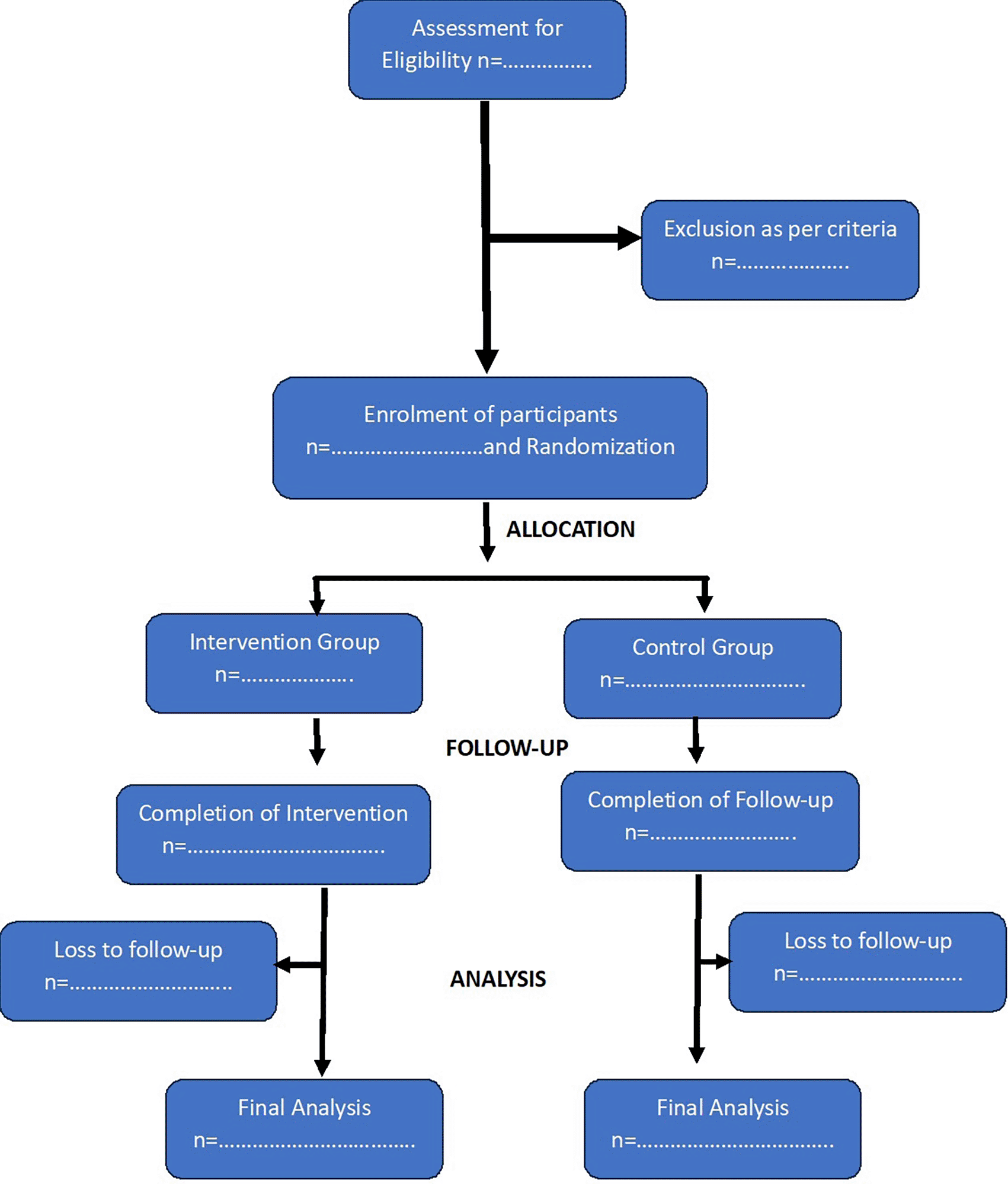 The children and their parents signing the informed consent will be enrolled in the study. All enrolled children hospitalized in A.V.B.R.H., scheduled to stay for a minimum of three days in the hospital, will be assigned a Unique ID. Children will be allocated to intervention or control groups using a block randomization process22,23 with age groups as the blocking variable. Intervention group will receive the play therapy sessions along with the required treatment and nursing care during hospitalization stay. Sociodemographic profile and baseline assessments will be done. Play therapy sessions will be conducted at the dedicated play area in hospital. Also, these children from the intervention area will receive the play sessions at scheduled monthly home visits. Figure 1 shows the anticipated Consort Flow Diagram of study participants.