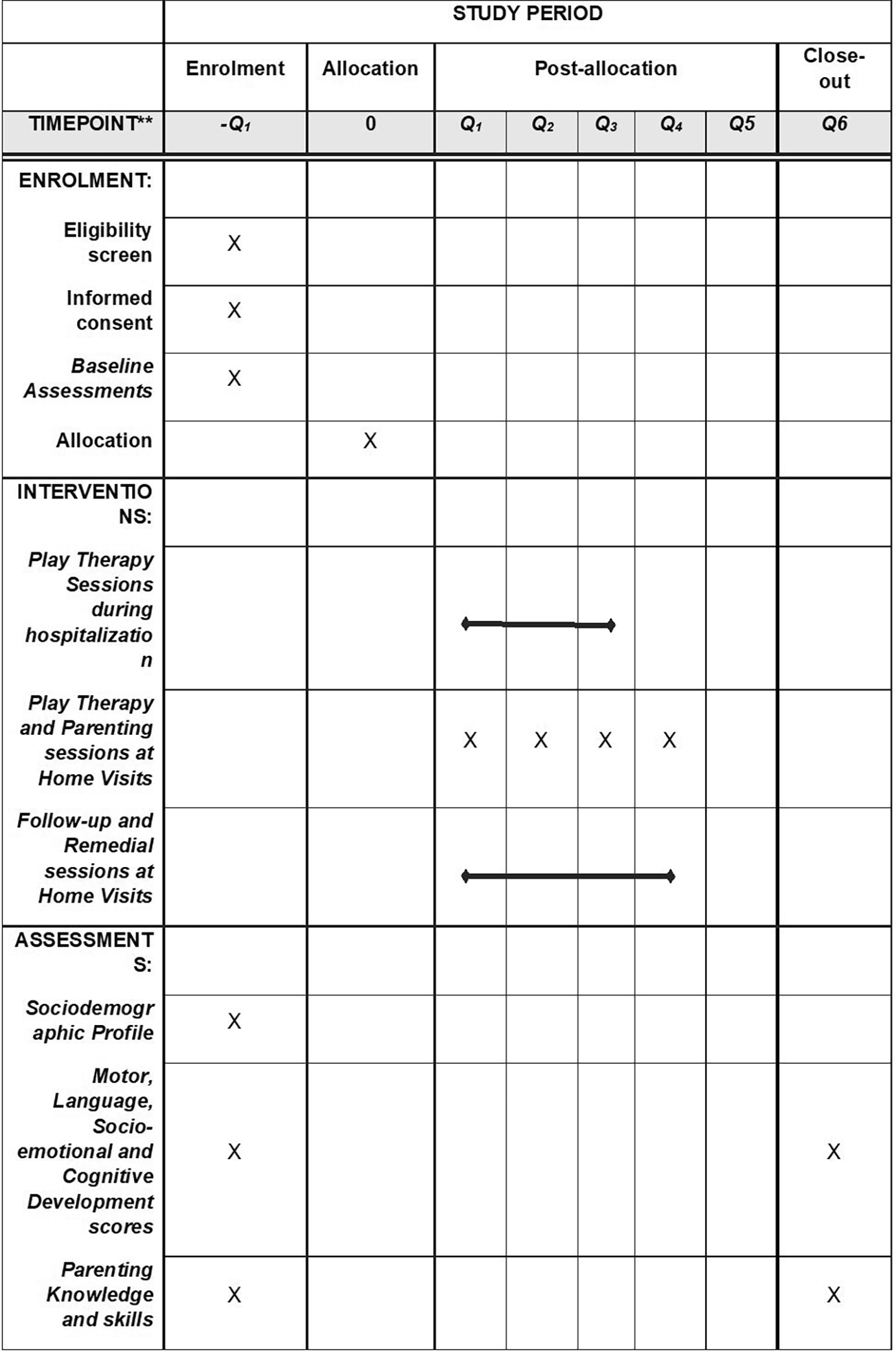 After one-year of enrollment, assessments of age-appropriate developmental milestones of children will be done either in the hospital ECD Centre or through personalized home visit to the enrolled family. Age-appropriate assessment tools will be used. Reports will be shared with parents, and follow-up instructions and meeting schedules will be shared. Figure 2 shows the schedule of enrolment, interventions, and assessments.