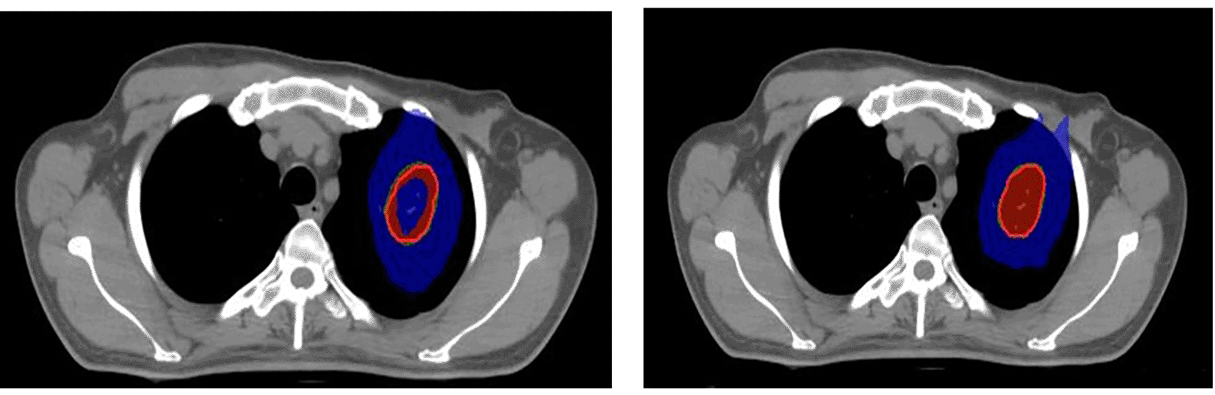 Red: 100% prescribed dose; Green: 95% prescribed dose; Blue: 50% prescribed dose; Yellow: 115% prescribed dose.
