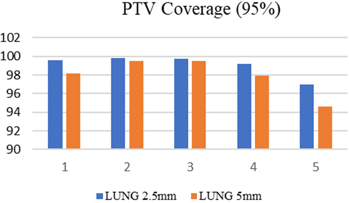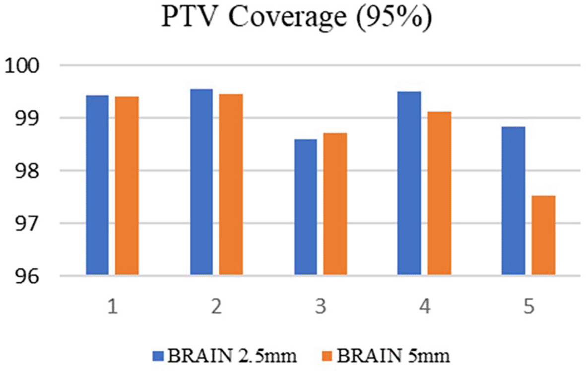The study included 10 patients, five each with brain and lung targets. Two treatment plans were performed for each case using Elekta’s Monaco (5.11.03) treatment planning system (TPS) with 2.5 mm and 5 mm MLC. An X-ray photon beam of energy 6FFF was used for planning purposes with various gantry, couch, and collimator combinations. These two plans were compared using target coverage (TC), conformity index (CI), homogeneity index (HI), gradient index (GI), and organ at risk (OAR) doses.
