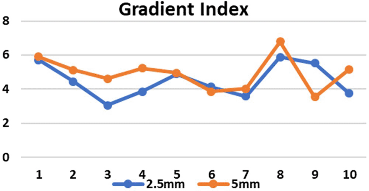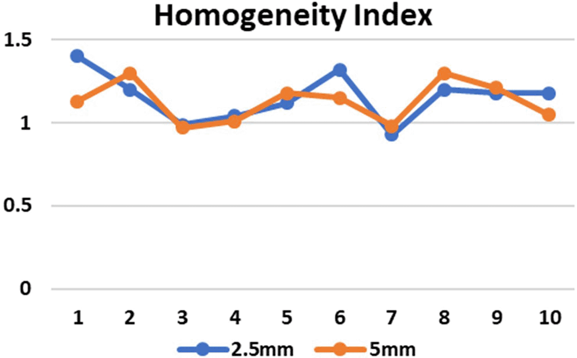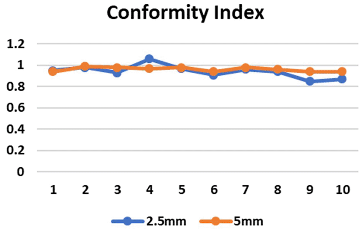 CI in both the SRS and SBRT plans yielded excellent results. These values were found to be similar for both the planning techniques. In the 5 mm and 2.5 mm width MLC the mean CI for the brain targets were 0.972±0.01924 and 0.9780±0.04970 respectively (p=0.808) and for the lung targets were 0.9520±0.01789 and 0.9060±0.04615 respectively (p=0.071) which indicates that the target area is optimally covered (Figure 5) and there is no significant difference in the CI for brain and lung targets in both MLC designs. The HI values in case of 2.5 mm and 5 mm MLC in brain targets were 1.150±0.16093 and 1.1180±0.13293 respectively (p=0.741) and for the lung targets the values were 1.1620±0.14220 and 1.1380±0.12677 respectively (p=0.785). The HI values were also found to be close to unity, indicating a homogenous dose distribution across the tumor volume (Figure 6). The GI values for 5 mm and 2.5 mm MLC in brain targets were 5.1660±0.47732 and 4.3880±1.00912, respectively (p=0.158), and for the lung targets 4.670±1.33318 and 4.5720±1.05611, respectively(p=0.895). Although there was no significant difference between the GI values, the obtained results showed that GI was better in the 2.5 mm APEX based plans compared to 5 mm MLC (Figure 7). The mean and maximum doses to the OARs in both treatment planning techniques for both 2.5 mm and 5 mm MLC based plans were found to be close to each other. Although there was no significant difference between the two, it has been shown that the doses were slightly lower in most of the OARs in lung targets, whereas in brain targets, we received mixed results, indicating that both techniques are comparable (Tables 1 and 2). Data on the same have been made available online.29