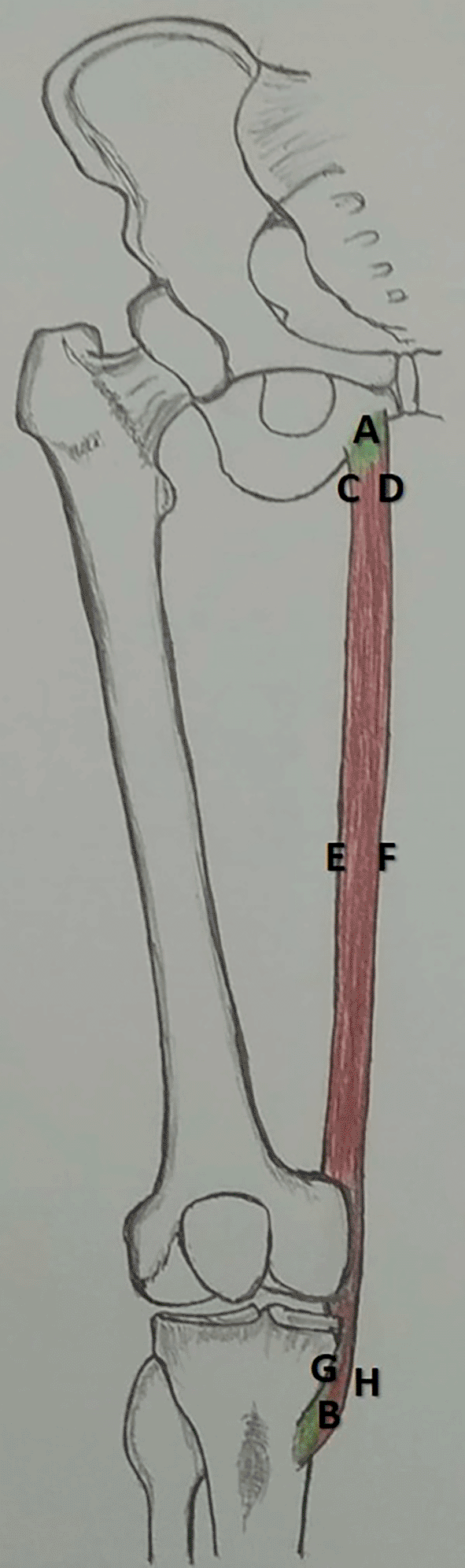 This study involved formalin-fixed lower-limb specimens that were available at the Department of Anatomy. A total of 44 specimens were studied, of which 25 were right-sided and 19 left-sided. Sex was not considered. Specimens with congenital malformations were excluded from this study. The institutional ethics committee, Kasturba Medical College, Mangalore (Reg. No. ECR/541/Inst/KA/2014/RR-17) has reviewed the protocol of this study and approved on seventeenth of October, 2018 (IEC KMC MLR 10-18/395). After the meticulous dissection of the adductor compartment of the thigh, gracilis muscle was exposed. This was cleaned from its origin to the dissection. The length of the gracilis (AB in Figure 1) was measured from its origin to the musculotendinous junction. The width was measured at three different points: the origin (CD in Figure 1), midpoint (EF in Figure 1), and musculotendinous junction (GH in Figure 1). The pedicles of the gracilis were counted, and their distance from the pubic tubercle was measured. The length and width were measured using a measuring tape and digital Vernier caliper (Mitutoyo, Japan), respectively. The topographical location of the pedicle entry was measured using a measuring tape. Each dimension was measured three times by three different persons, and the average was considered to avoid intra-observer bias. SPSS software, https://www.ibm.com/products/spss-statistics (version 27) was used to perform the paired t-test. We confirm that, our institution has obtained a copyright license of this software. The protocol of this study was archived in the dx.doi.org/10.17504/protocols.io.e6nvwdm6dlmk/v1.