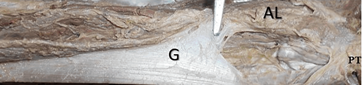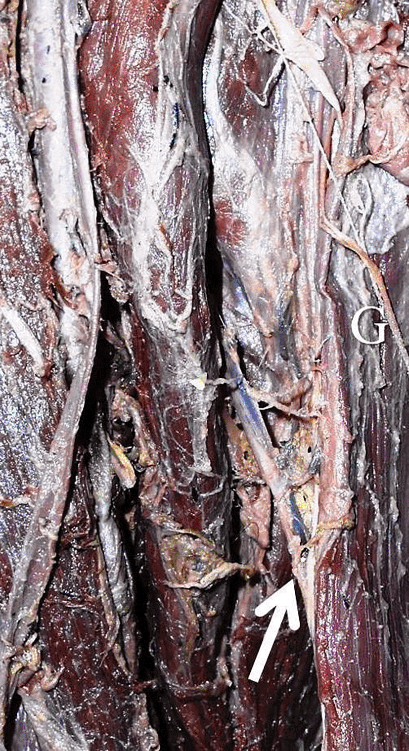 The gracilis muscle’s length was 369.9±34.1 mm and 359.6±29.6 mm over the right and left sides. The width of right gracilis was 25±8.4 mm, 20.4±6.2 mm and 10.6±5.6 mm at the origin, midpoint and at the musculotendinous junction. The same over the left side were 26.7±8.6 mm, 20.6±9.1 mm and 10.4±6.4 mm respectively. The number of gracilis ranged from one to three. The location of first pedicle was 93.6±35.6 mm and 68.9±35.8 mm away from the pubic tubercle on the right and left sides, respectively. The second and third pedicles were entering at a distance of 153.1±38.8 mm and 101.3±20.8 mm, 214.6±86.8 mm and 145.3±124.4 mm over the right side and left side. The accessory head of the origin of the gracilis was observed in only one cadaver (2.3%), which originated from the adductor longus.