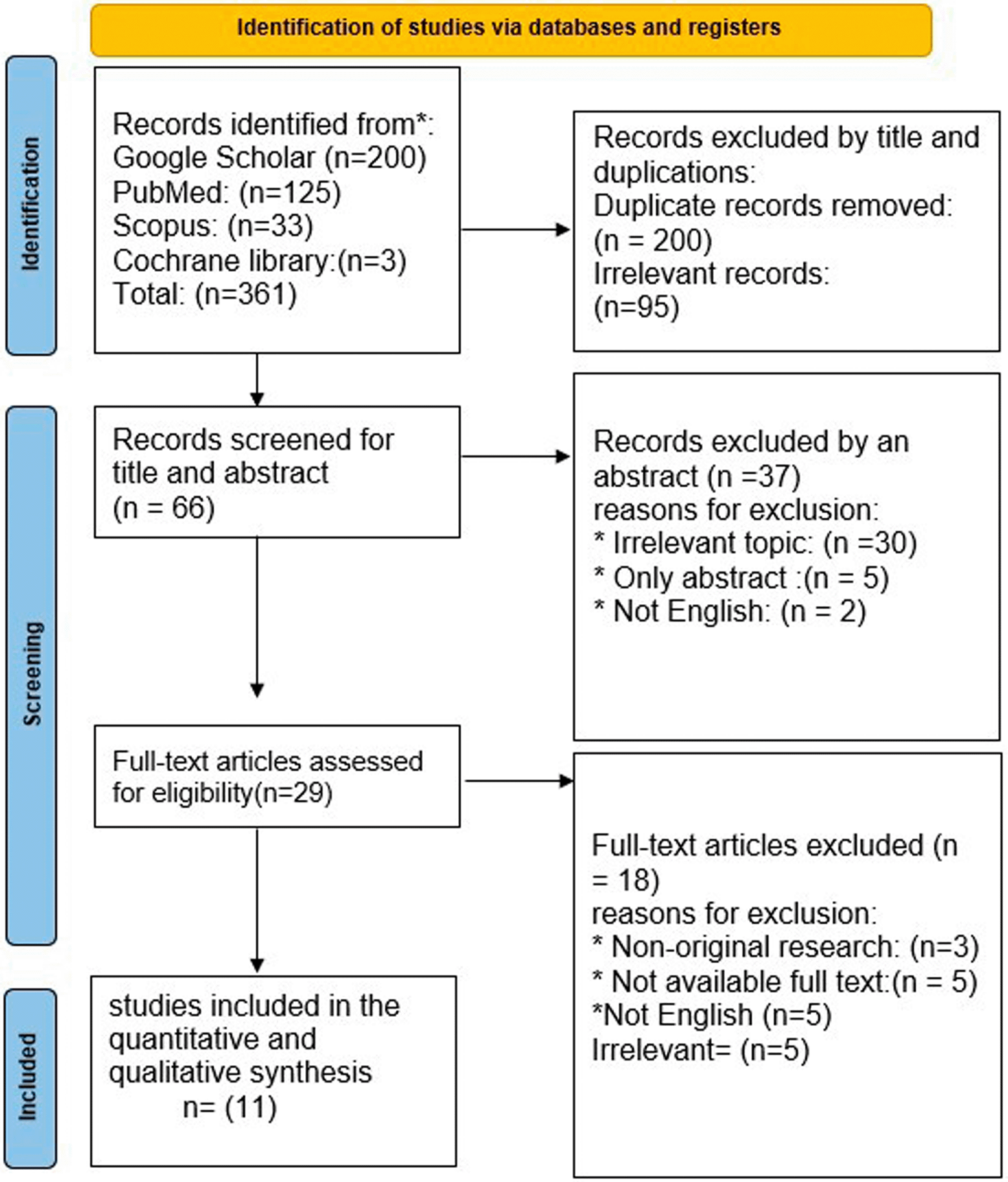 We retrieved 361 records from our search, 200 duplicates were removed, and the remaining 66 titles and abstracts were screened. Then, 29 potential full texts were assessed, and 11 studies were included in this review.18–28 The flow of studies is illustrated in Figure 1.