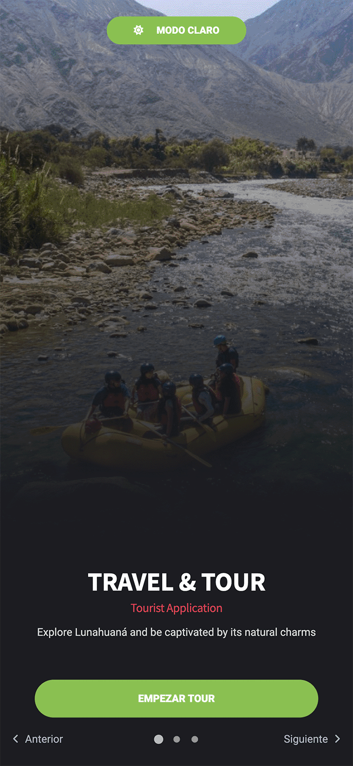 In addition to these core functionalities, the system integrates a carefully designed user interface and interaction model to ensure accessibility and usability. Upon entering the platform, users encounter a welcome view introducing the destination and displaying an interactive dashboard that lists the main activities available in the Lunahuaná district. Each activity is presented as a card element containing key information such as the activity duration, a visual preview, and details about the tourism services offered by the company. This design supports intuitive navigation and allows users to make selections with a single touch or click, regardless of device type.