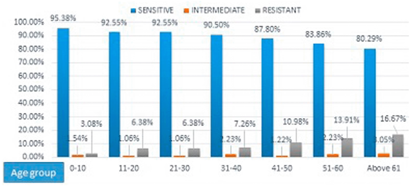 Isolates from children in the age group 0-10 were more susceptible to tigecycline (95.38%), as the age increases there is trend for decreasing susceptibility to tigecycline (Figure 1). Among the samples, resistance to tigecycline was most common in isolates from cerebrospinal fluid (CSF) samples (44.44%) and high susceptibility was seen in blood, body fluids (93%) and pus (91%) (Table 1).11