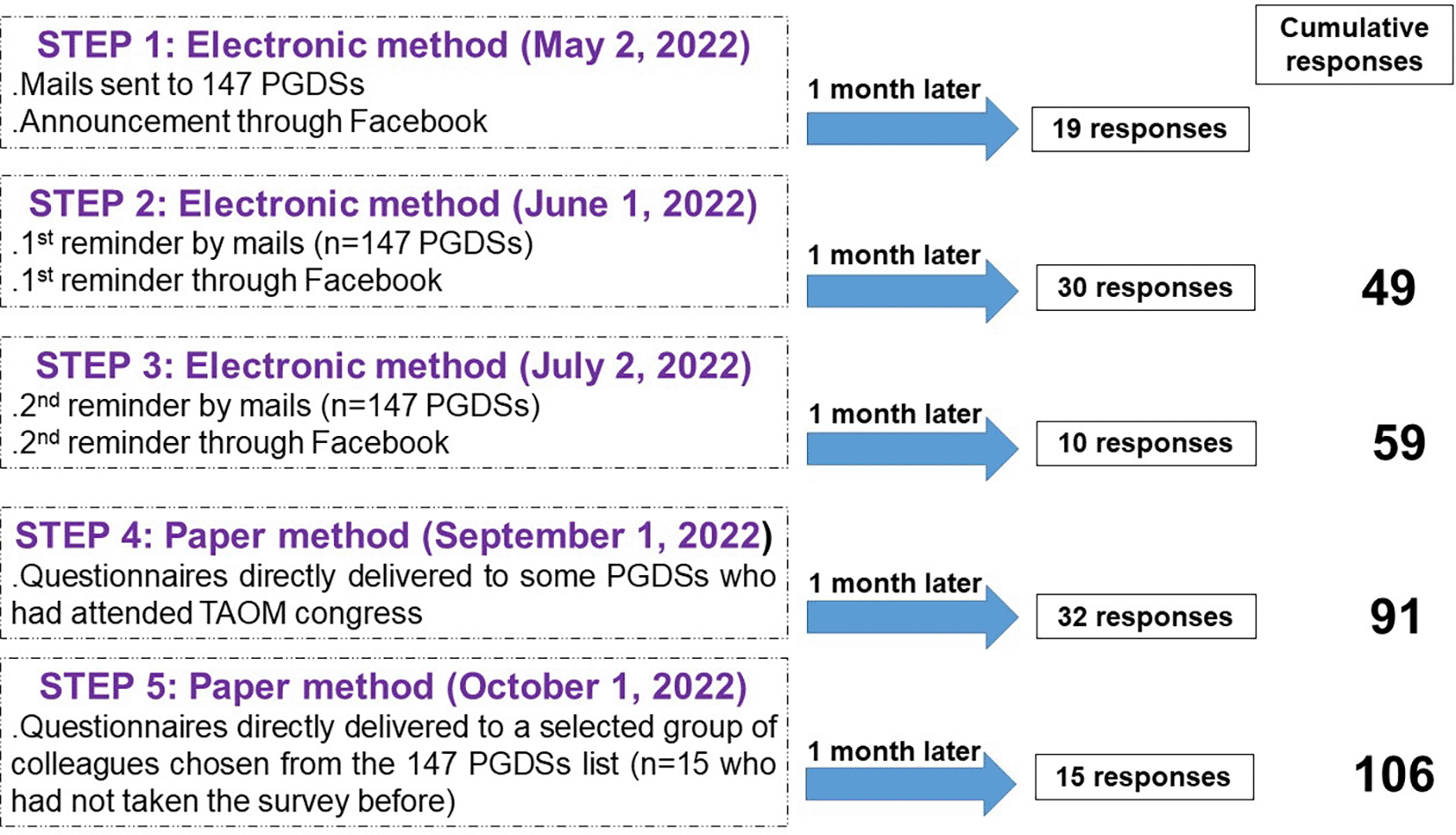 All 147 PGDSs were invited to participate in the survey, and a five-step recruitment process, outlined in Figure 1, was implemented. To summarize, the following three recruitment methods were utilized: i) Individual emails were sent to all 147 PGDSs; ii) Announcements were disseminated through the Facebook pages of the 14 medical dental departments of the FMDM; and iii) Convenience sampling was employed, where questionnaires were distributed to PGDSs who had attended the medical congress of the Tunisian Association of Oral Medicine (n=32) or were acquainted with authors involved in the study ( i.e. ; 15 colleagues chosen from the 147 PGDSs’ list and who had not taken the survey before). During steps 1 to 3, which involved the electronic enrolment method, 59 PGDSs were recruited. In steps 4 and 5, which involved the paper-based enrolment method, an additional 47 PGDSs were recruited. During the paper-based enrolment method ( i.e. ; steps 4 and 5), two researchers (RK and MK in the authors’ list) asked the PGDSs if they had taken the survey before. If they had not, the researchers administered the questionnaire and collected the surveys from the PGDSs upon completion.