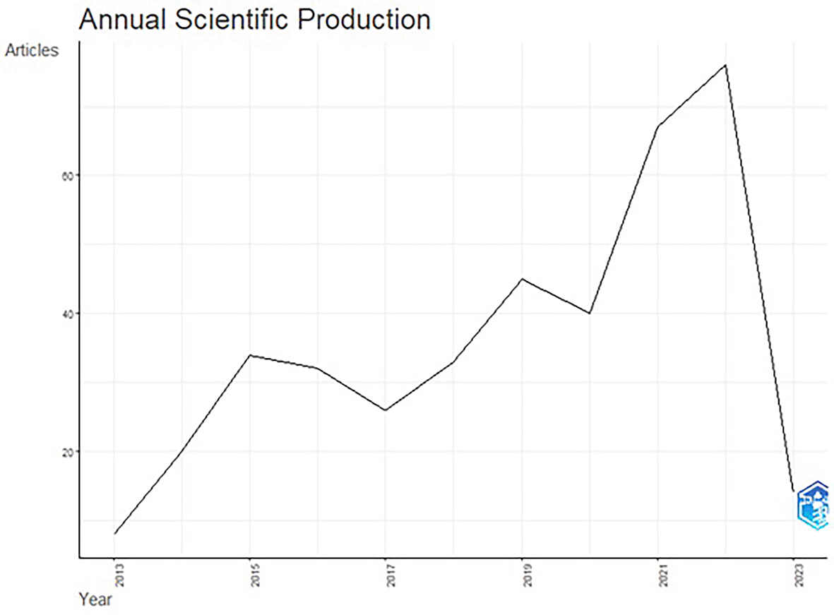 The total publication trend through 2013-2023 is represented in Figure 3 and Figure 4 illustrates publication trends over a decade. The publication trend from 2015–2022 displays an ascending trend in the number of articles published. The publication of articles increased close to double during the years 2021 & 2022. An upward graph has continued until 2022, although the annual growth rate remained fixed at 5.76%. In 2022, the number of published articles reached 76, and 2023 will likely see a further increase in research trends in functional ingredients. This rise in publications could be associated with COVID-19 and consistent efforts by the WHO to spread awareness of healthy food consumption and the development of alertness among the population about food choices.
