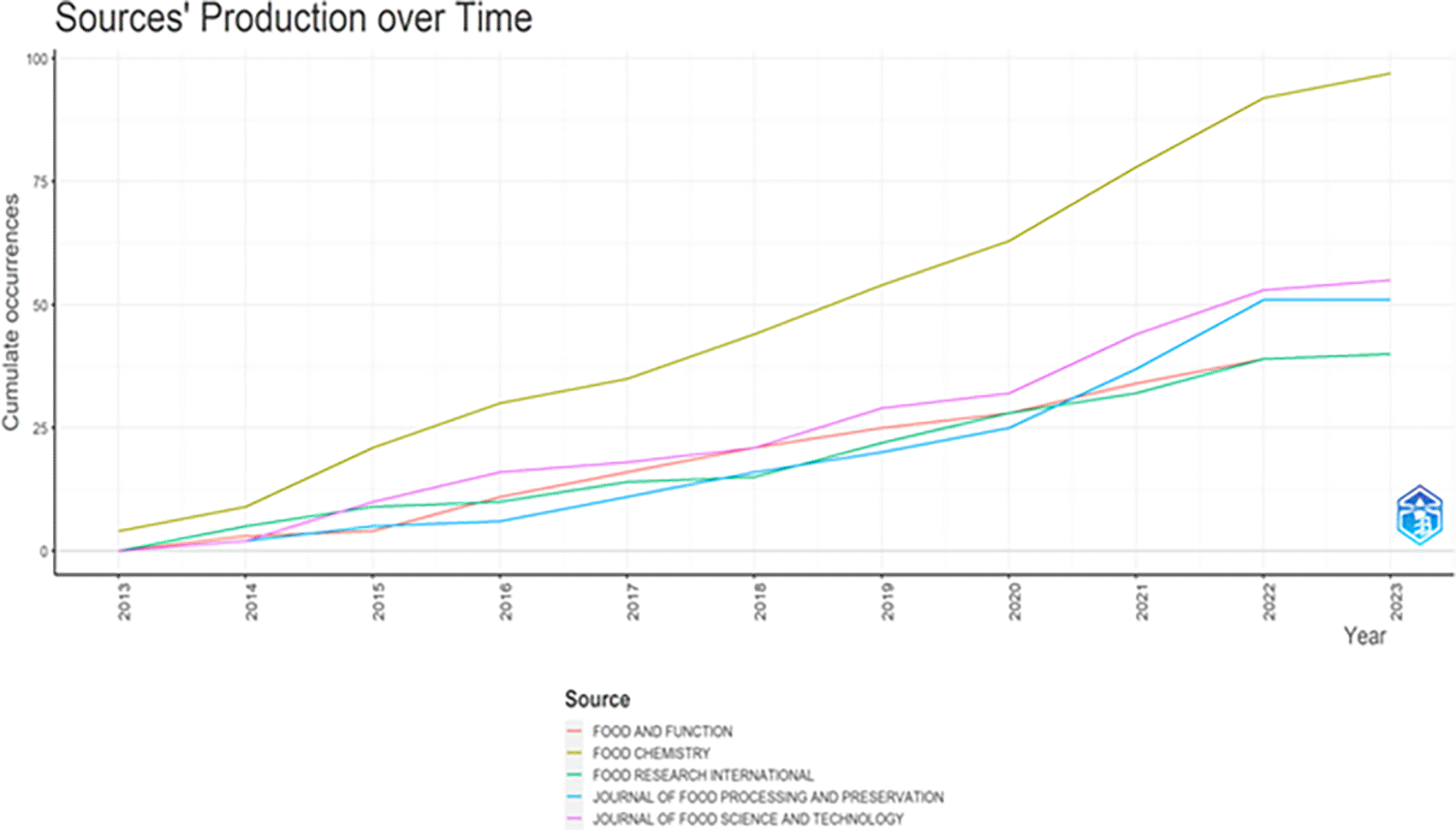 The results indicate that “Food Chemistry” and “Food & Function” were among the most contributing journals, with 97 and 40 articles, respectively. Both articles achieved an “h” index of 39 & 19 respectively.