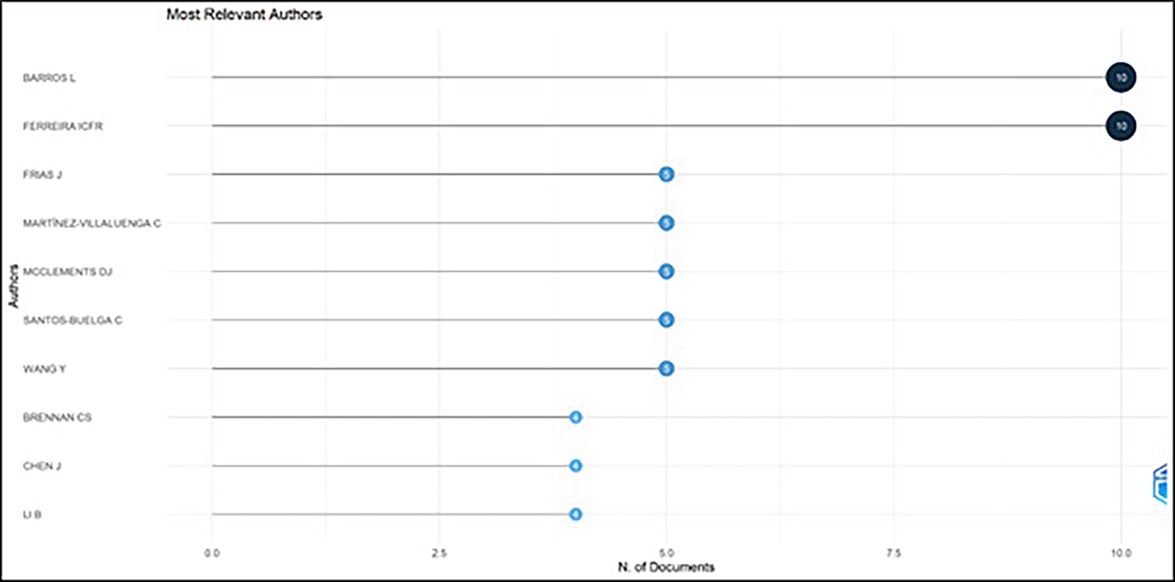 Table 4 and Figure 5 exhibit the most prolific authors in functional ingredients. It has illustrated that “Barros L” and “Ferreira ICFR” are the most prominent authors in this field, with ten publications each. The most prominent authors, Barros L, 2022 and Ferreira ICFR, 2022 investigated wild edible mushrooms and concluded that they can be a source of nutritional and functional components. Hence, wild edible mushrooms can be incorporated into a balanced diet as a source of proteins and can be utilized for innovative bio-based formulation. Frias J, 2020; Martínez-Villaluenga C, 2020 studied barley grain (flour) and found the ideal method of germinating grain for 3.5 days, maintaining the temperature at 16°C.for producing nutrient-rich and functional barley flour. It is worth emphasizing that these articles have studied various foods like rosemary, xoconostle fruit (opuntia mature scheinvar cv. Rosa) by-products, tarragon, and pineapple by-products for their phenolic and bioactive compounds as well as techniques like fermentation, ultra-sonication, and biochemical and molecular profiling. Table 6 displays a summary of foods investigated by prominent authors.