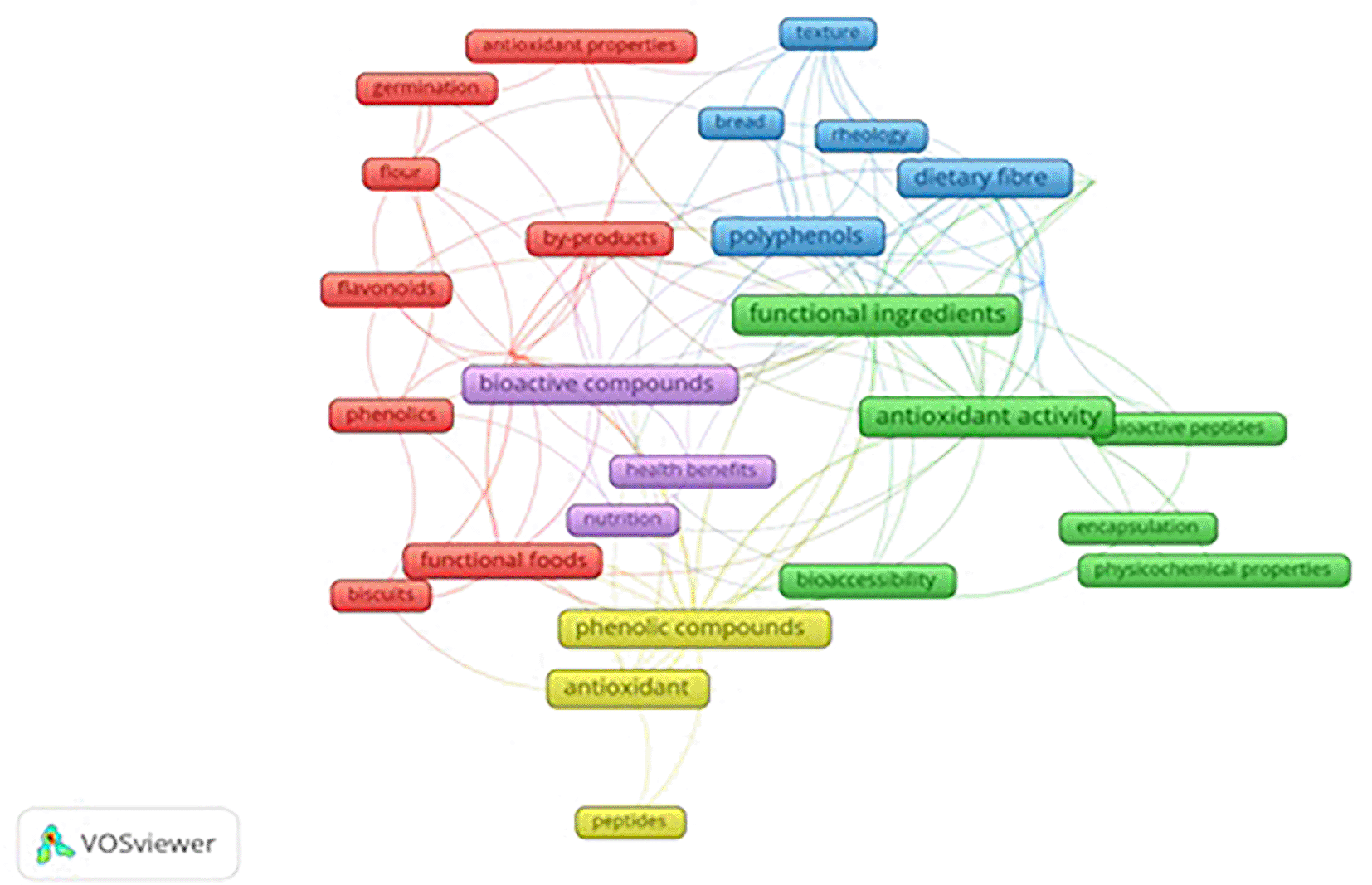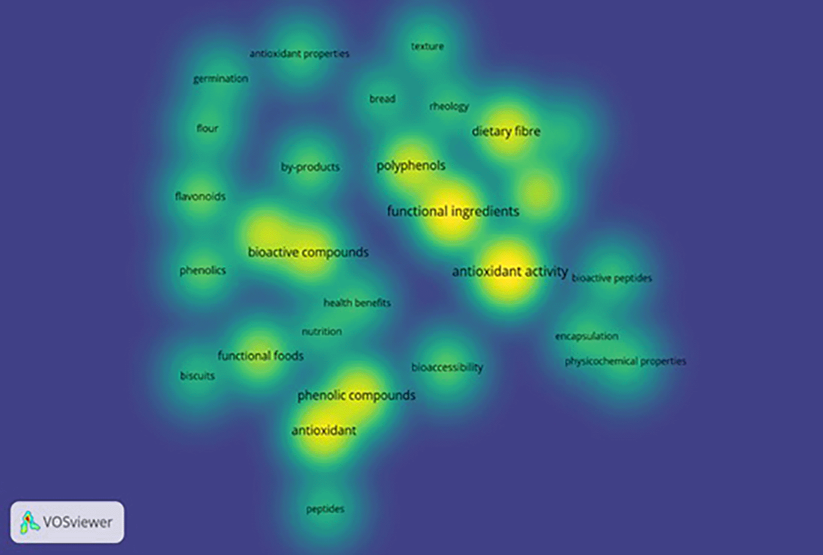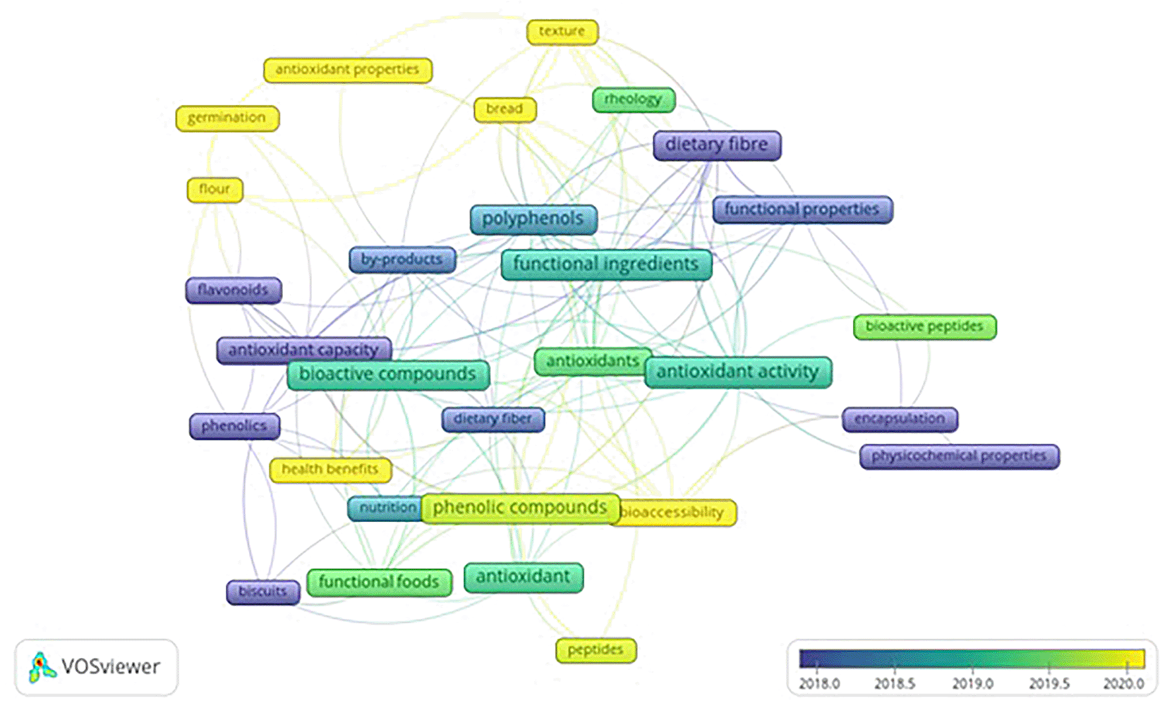 The depth of researched areas can be seen in Figure 8. Deep concentration of colors interprets topics undertaken by more researchers to study. The most deliberated topics by researchers are functional ingredients, antioxidant activity, bioactive compounds, phenolic compounds, antioxidants, polyphenols, dietary fiber, functional foods, flavonoids, phenols, and bioaccessibility.